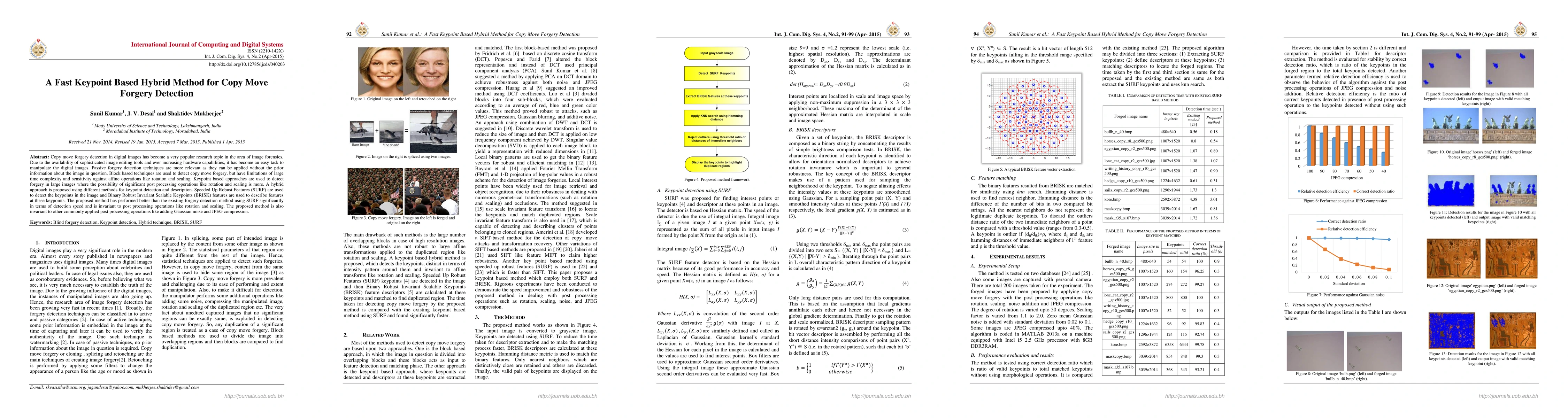 This paper proposes a fast hybrid method for detecting copy move forgeries in digital images using keypoint-based techniques. The method combines SURF for keypoint detection and BRISK for feature description, achieving better performance in speed and invariance to common post-processing operations like rotation, scaling, Gaussian noise, and JPEG compression compared to existing SURF-based methods.