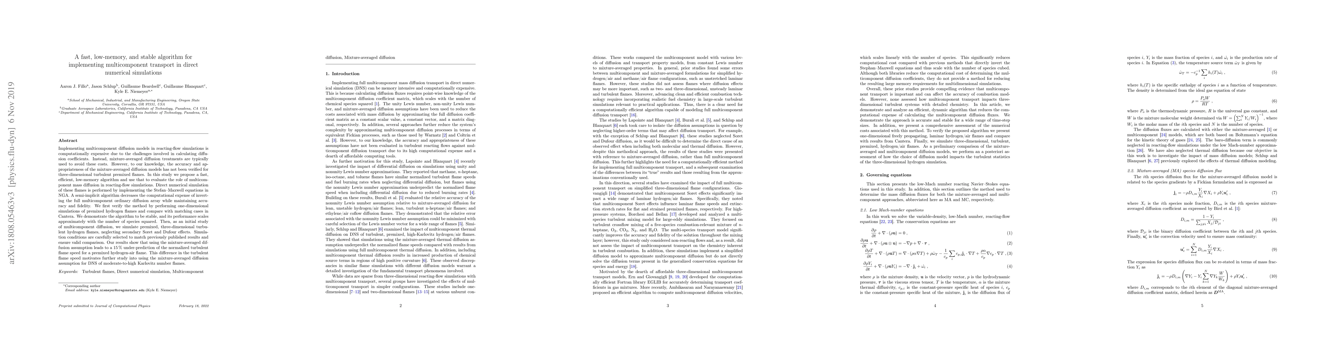 This paper proposes a fast, low-memory algorithm for multicomponent diffusion in direct numerical simulations of turbulent premixed flames, demonstrating that mixture-averaged diffusion models under-predict turbulent flame speed by 15% compared to detailed multicomponent diffusion models. The algorithm scales efficiently with the number of species and maintains stability.