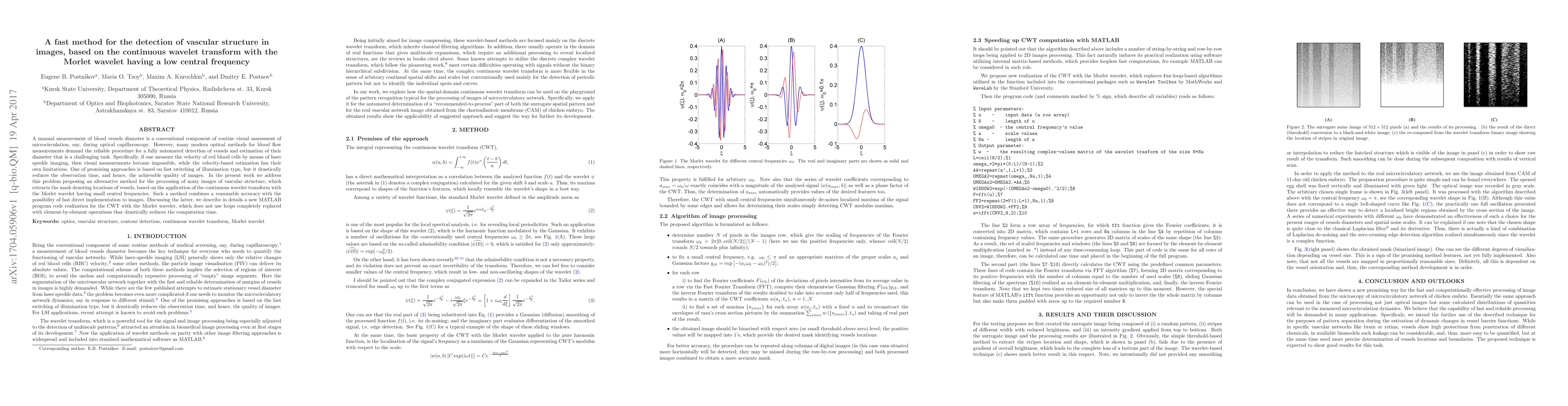 A manual measurement of blood vessels diameter is a conventional component of routine visual assessment of microcirculation, say, during optical capillaroscopy. However, many modern optical methods for blood flow measurements demand the reliable procedure for a fully automated detection of vessels and estimation of their diameter that is a challenging task. Specifically, if one measure the velocity of red blood cells by means of laser speckle imaging, then visual measurements become impossible, while the velocity-based estimation has their own limitations. One of promising approaches is based on fast switching of illumination type, but it drastically reduces the observation time, and hence, the achievable quality of images. In the present work we address this problem proposing an alternative method for the processing of noisy images of vascular structure, which extracts the mask denoting locations of vessels, based on the application of the continuous wavelet transform with the Morlet wavelet having small central frequencies. Such a method combines a reasonable accuracy with the possibility of fast direct implementation to images. Discussing the latter, we describe in details a new MATLAB program code realization for the CWT with the Morlet wavelet, which does not use loops completely replaced with element-by-element operations that drastically reduces the computation time.