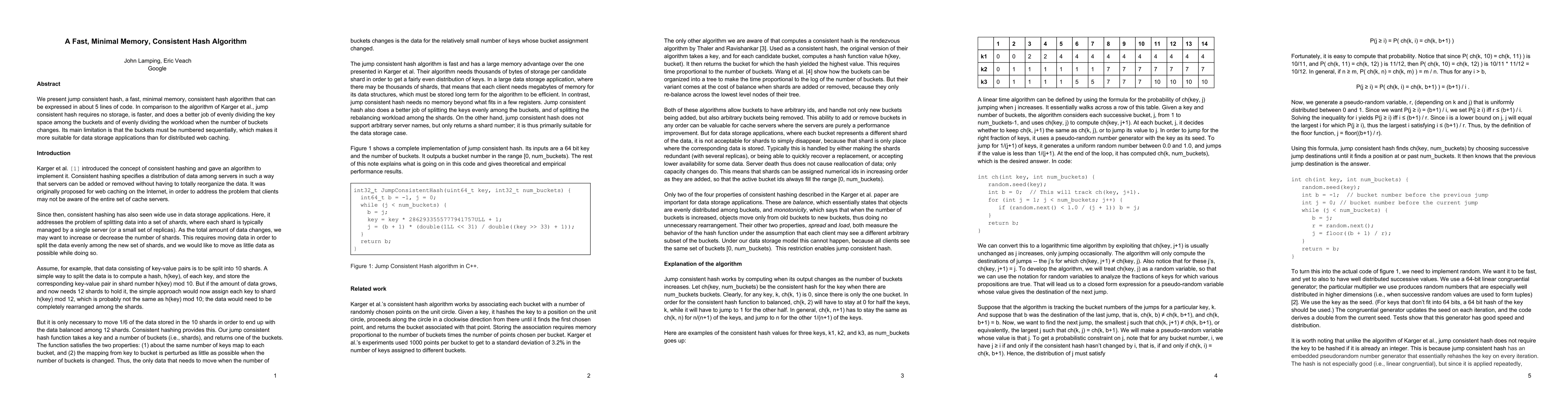 Summary: Jump consistent hash is a fast, memory-efficient algorithm requiring minimal code, offering superior performance and even key distribution over existing methods, though it is best suited for sequential bucket numbering in data storage rather than distributed web caching.