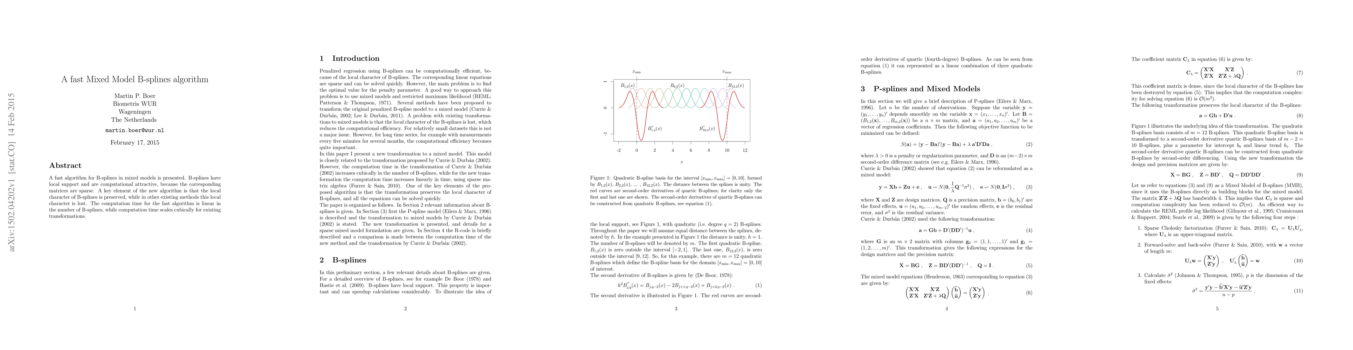 This paper introduces a fast algorithm for B-splines in mixed models that maintains the local support of B-splines, resulting in linear computation time compared to cubic scaling in existing methods. The algorithm leverages the sparsity of B-spline matrices for computational efficiency.