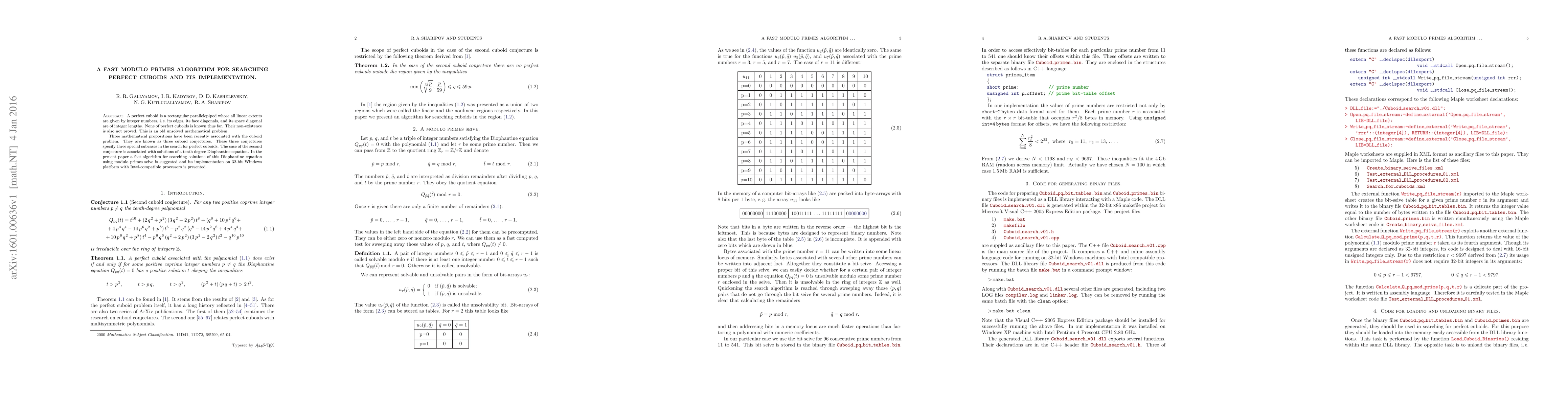 A perfect cuboid is a rectangular parallelepiped whose all linear extents are given by integer numbers, i. e. its edges, its face diagonals, and its space diagonal are of integer lengths. None of perfect cuboids is known thus far. Their non-existence is also not proved. This is an old unsolved mathematical problem. Three mathematical propositions have been recently associated with the cuboid problem. They are known as three cuboid conjectures. These three conjectures specify three special subcases in the search for perfect cuboids. The case of the second conjecture is associated with solutions of a tenth degree Diophantine equation. In the present paper a fast algorithm for searching solutions of this Diophantine equation using modulo primes seive is suggested and its implementation on 32-bit Windows platform with Intel-compatible processors is presented.
