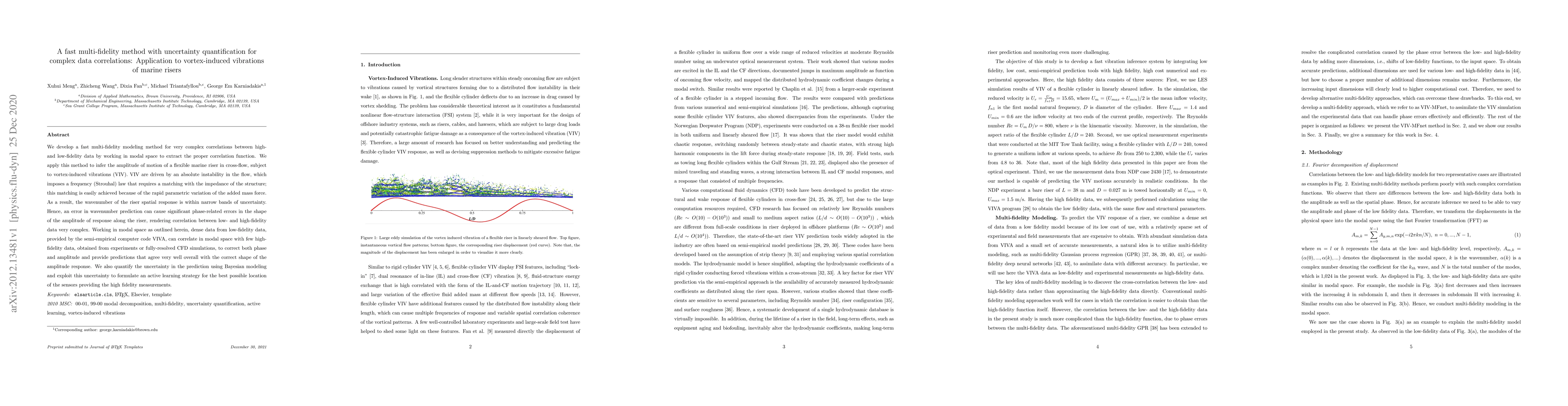 This paper presents a fast multi-fidelity modeling method for complex correlations between high- and low-fidelity data, applied to vortex-induced vibrations (VIV) of marine risers. The method works in modal space to extract proper correlation functions, enabling accurate predictions of riser motion amplitude and uncertainty quantification using Bayesian modeling.