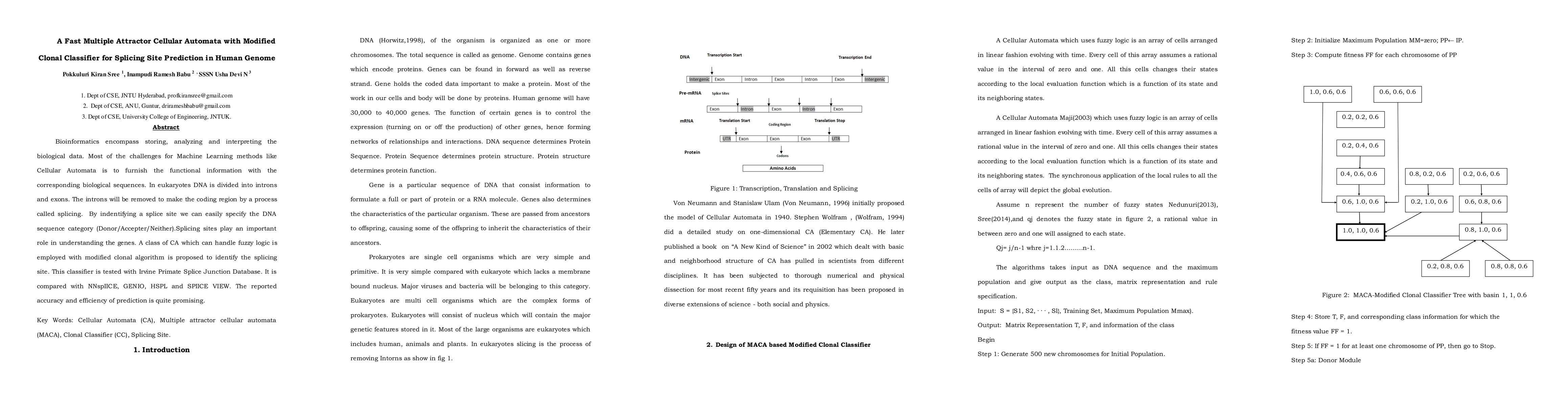 This paper proposes a fast multiple attractor cellular automata with a modified clonal classifier to predict splicing sites in the human genome. The method is tested on the Irvine Primate Splice Junction Database and shows promising accuracy and efficiency compared to other existing models.