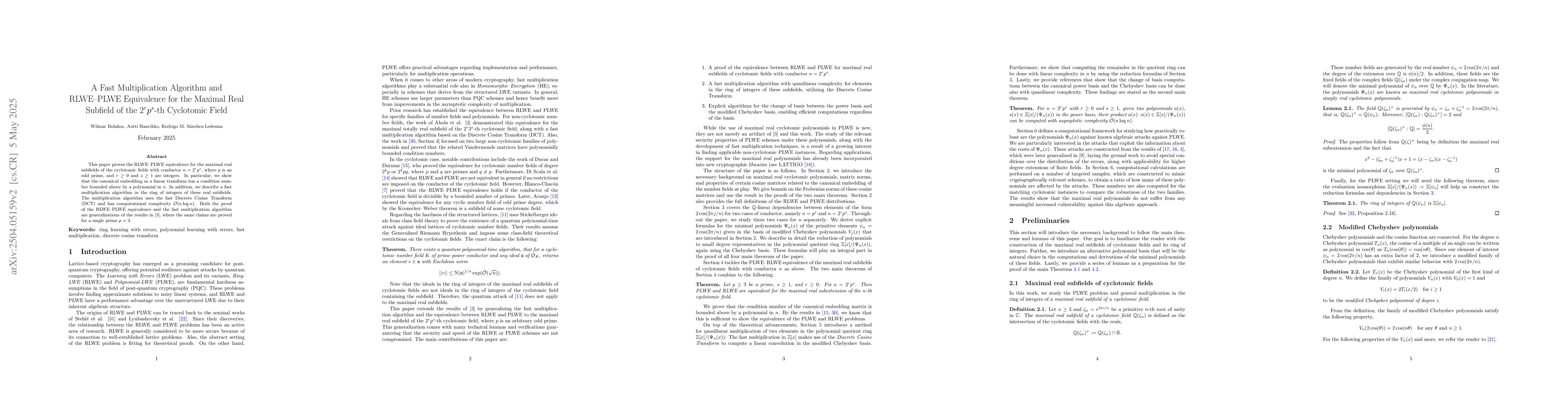 The paper proves RLWE-PLWE equivalence and presents a fast multiplication algorithm for the maximal real subfields of cyclotomic fields with conductor n = 2^r p^s, where p is an odd prime and r ≥ 0, s ≥ 1 are integers. It generalizes previous results by Ahola et al. for a single prime p = 3.