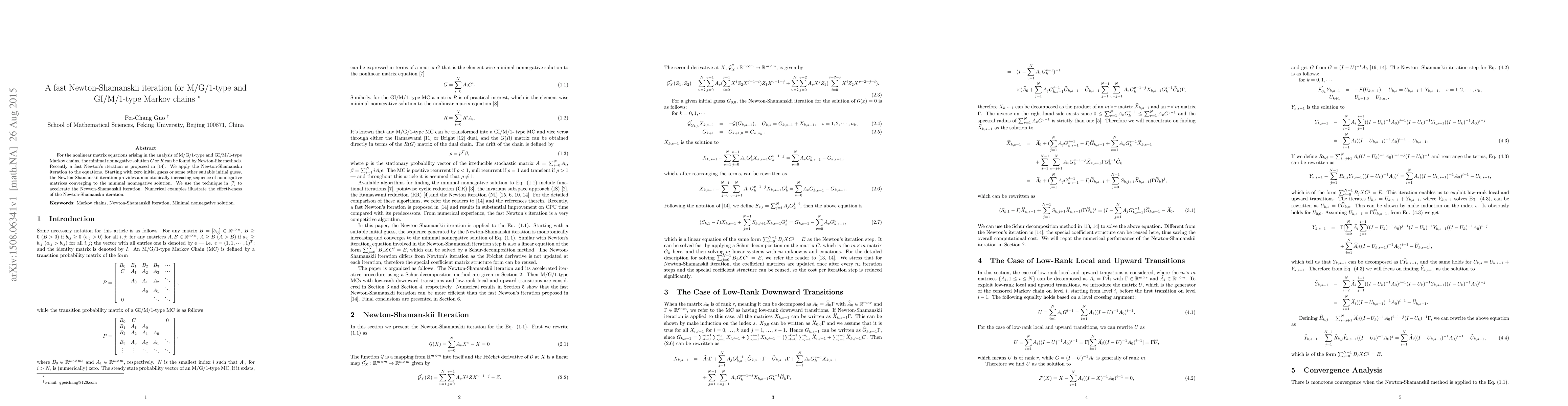 This paper proposes a fast Newton-Shamanskii iteration method for solving nonlinear matrix equations in M/G/1-type and GI/M/1-type Markov chains. The method converges monotonically to the minimal nonnegative solution, and numerical examples demonstrate its effectiveness.