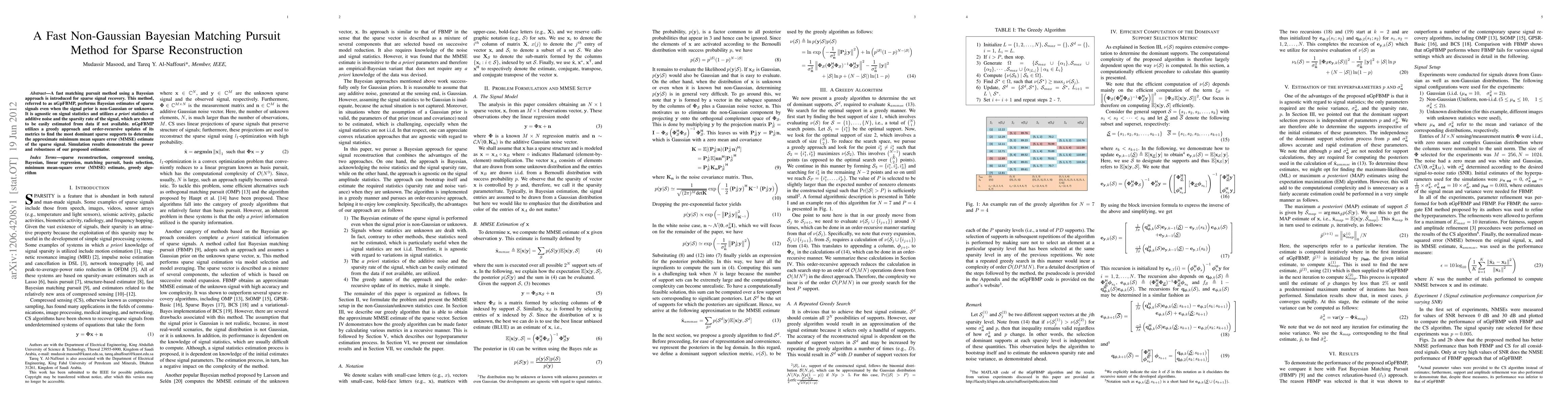 The paper introduces nGpFBMP, a fast Bayesian matching pursuit method for sparse signal reconstruction that can handle non-Gaussian signal priors, leveraging a priori noise statistics and sparsity rate. Simulation results show its effectiveness and robustness in sparse signal estimation.