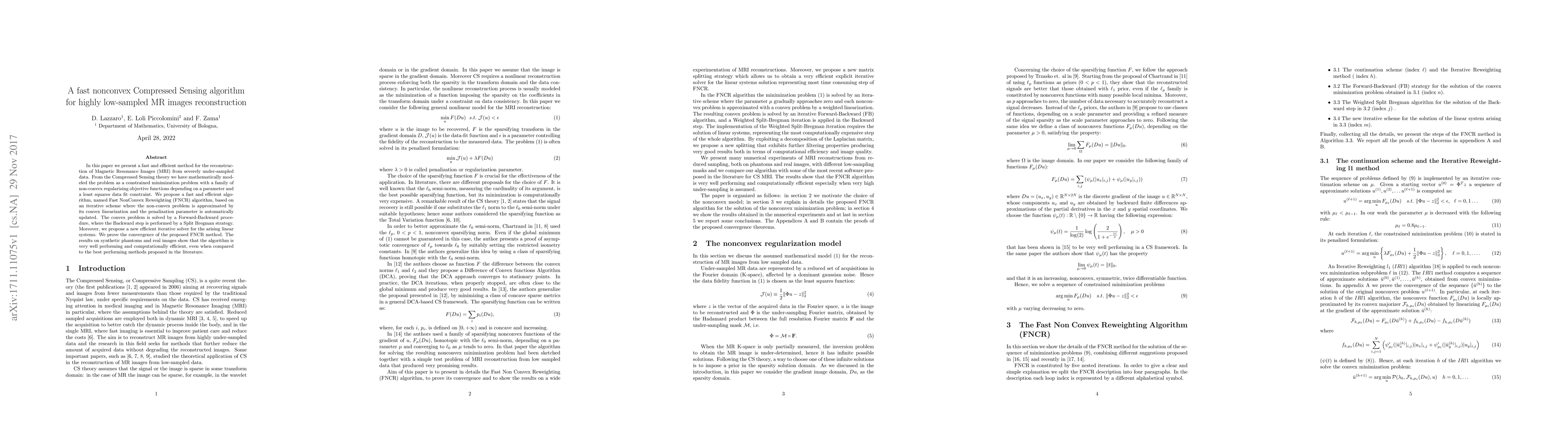 In this paper we present a fast and efficient method for the reconstruction of Magnetic Resonance Images (MRI) from severely under-sampled data. From the Compressed Sensing theory we have mathematically modeled the problem as a constrained minimization problem with a family of non-convex regularizing objective functions depending on a parameter and a least squares data fit constraint. We propose a fast and efficient algorithm, named Fast NonConvex Reweighting (FNCR) algorithm, based on an iterative scheme where the non-convex problem is approximated by its convex linearization and the penalization parameter is automatically updated. The convex problem is solved by a Forward-Backward procedure, where the Backward step is performed by a Split Bregman strategy. Moreover, we propose a new efficient iterative solver for the arising linear systems. We prove the convergence of the proposed FNCR method. The results on synthetic phantoms and real images show that the algorithm is very well performing and computationally efficient, even when compared to the best performing methods proposed in the literature.