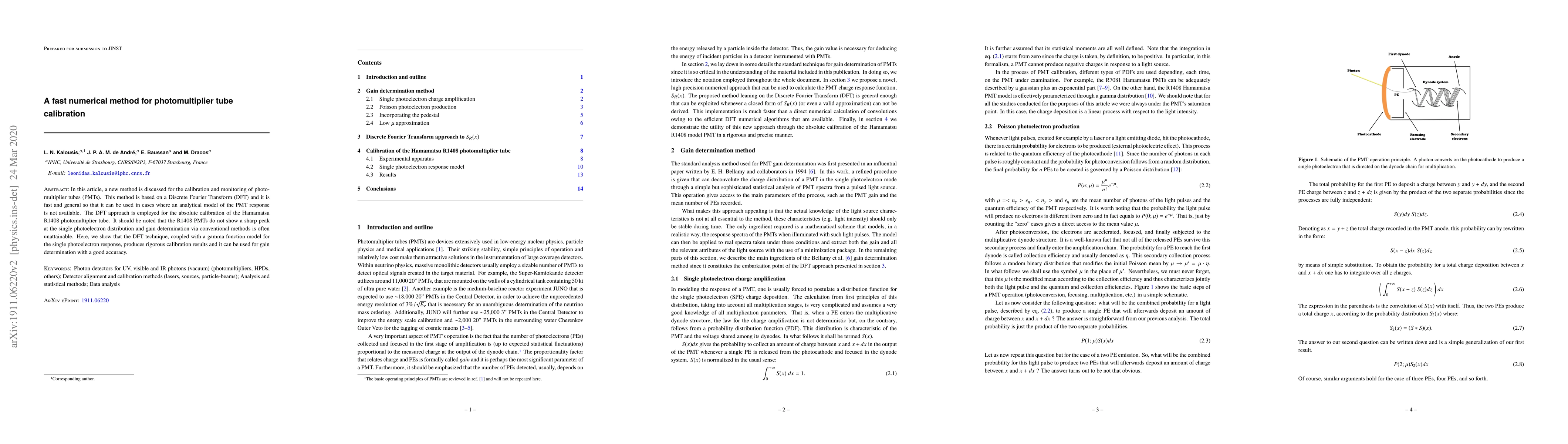 In this article, a new method is discussed for the calibration and monitoring of photomultiplier tubes (PMTs). This method is based on a Discrete Fourier Transform (DFT) and it is fast and general so that it can be used in cases where an analytical model of the PMT response is not available. The DFT approach is employed for the absolute calibration of the Hamamatsu R1408 photomultiplier tube. It should be noted that the R1408 PMTs do not show a sharp peak at the single photoelectron distribution and gain determination via conventional methods is often unattainable. Here, we show that the DFT technique, coupled with a gamma function model for the single photoelectron response, produces rigorous calibration results and it can be used for gain determination with a good accuracy.