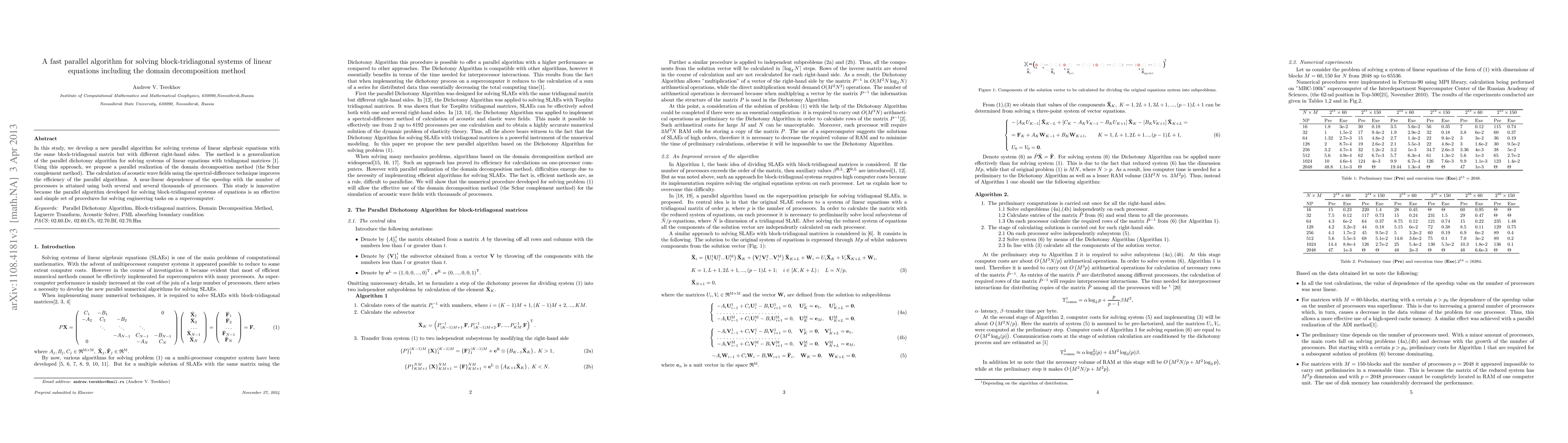This paper presents a novel parallel algorithm for solving block-tridiagonal systems of linear equations using the domain decomposition method. The proposed method achieves near-linear speedup with the number of processors, demonstrating its efficiency for engineering tasks on supercomputers.