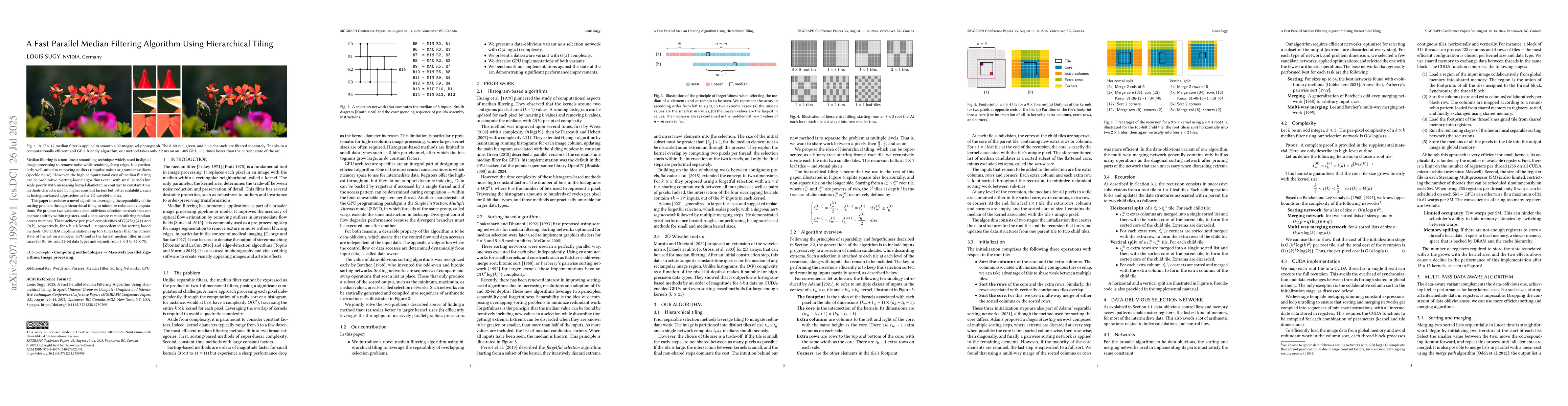 Median filtering is a non-linear smoothing technique widely used in digital image processing to remove noise while retaining sharp edges. It is particularly well suited to removing outliers (impulse noise) or granular artifacts (speckle noise). However, the high computational cost of median filtering can be prohibitive. Sorting-based algorithms excel with small kernels but scale poorly with increasing kernel diameter, in contrast to constant-time methods characterized by higher constant factors but better scalability, such as histogram-based approaches or the 2D wavelet matrix. This paper introduces a novel algorithm, leveraging the separability of the sorting problem through hierarchical tiling to minimize redundant computations. We propose two variants: a data-oblivious selection network that can operate entirely within registers, and a data-aware version utilizing random-access memory. These achieve per-pixel complexities of $O(k \log(k))$ and $O(k)$, respectively, for a $k \times k$ kernel - unprecedented for sorting-based methods. Our CUDA implementation is up to 5 times faster than the current state of the art on a modern GPU and is the fastest median filter in most cases for 8-, 16-, and 32-bit data types and kernels from $3 \times 3$ to $75 \times 75$.