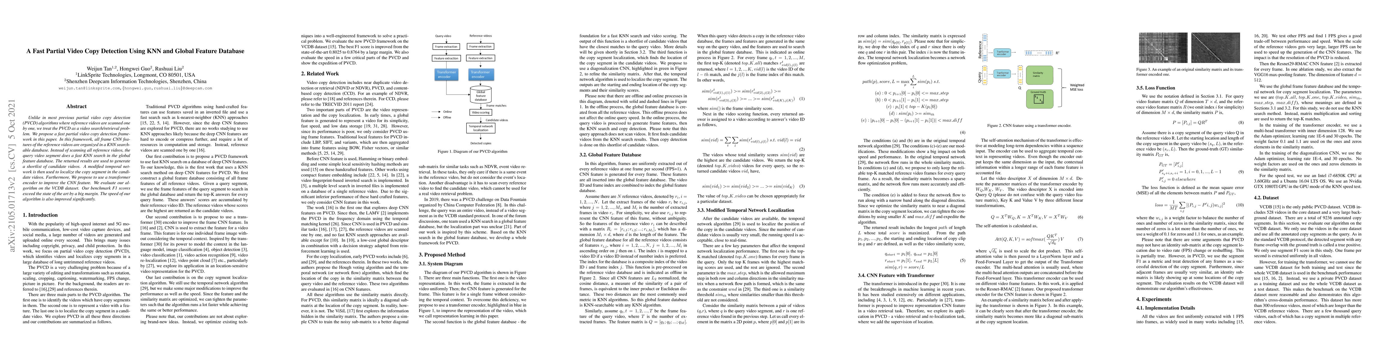 This paper introduces a fast partial video copy detection framework using KNN and a global feature database, achieving superior performance compared to existing methods. The method quickly identifies candidate videos through KNN search and refines detection using a modified temporal network.