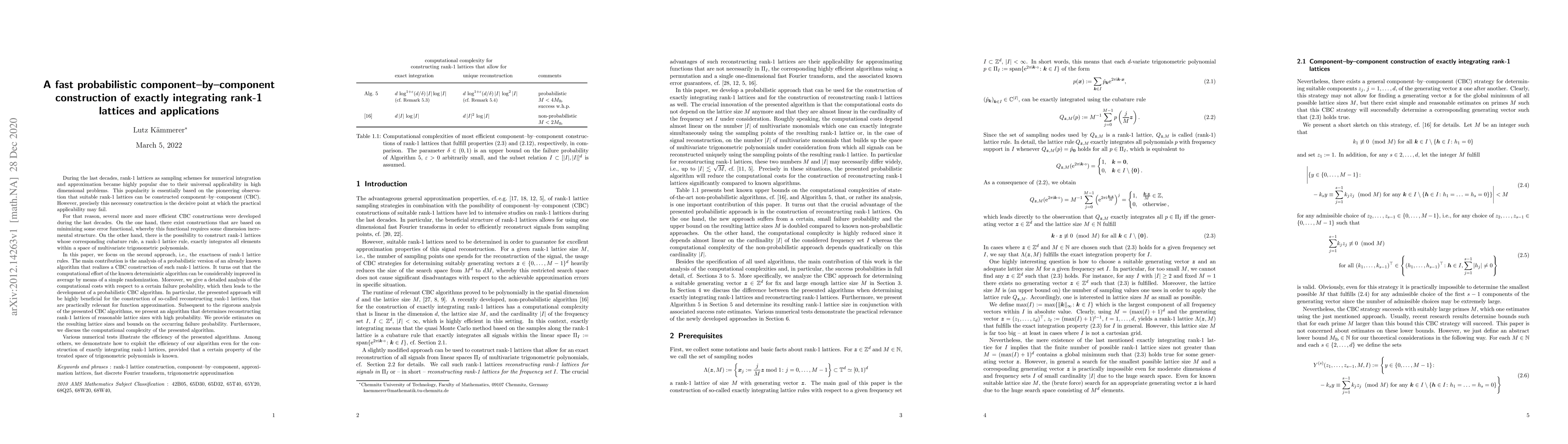 A new probabilistic algorithm improves the efficiency of constructing exactly integrating rank-1 lattices through randomization, enabling high-probability lattice construction for function approximation.