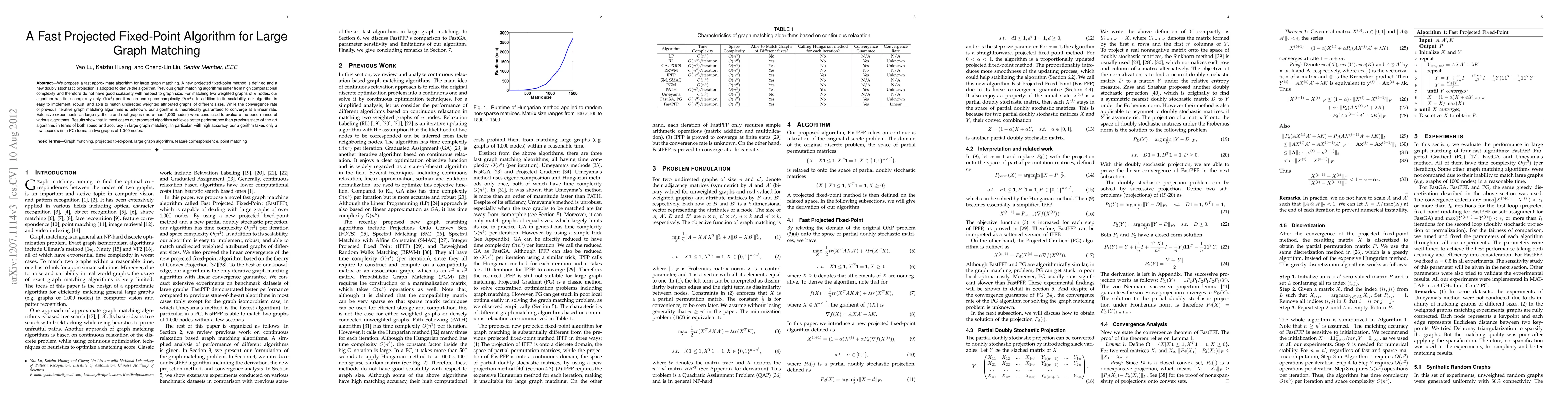 A fast approximate algorithm for large graph matching with O(n^3) time complexity and O(n^2) space complexity has been proposed, achieving better performance than previous state-of-the-art algorithms in terms of speed and accuracy.