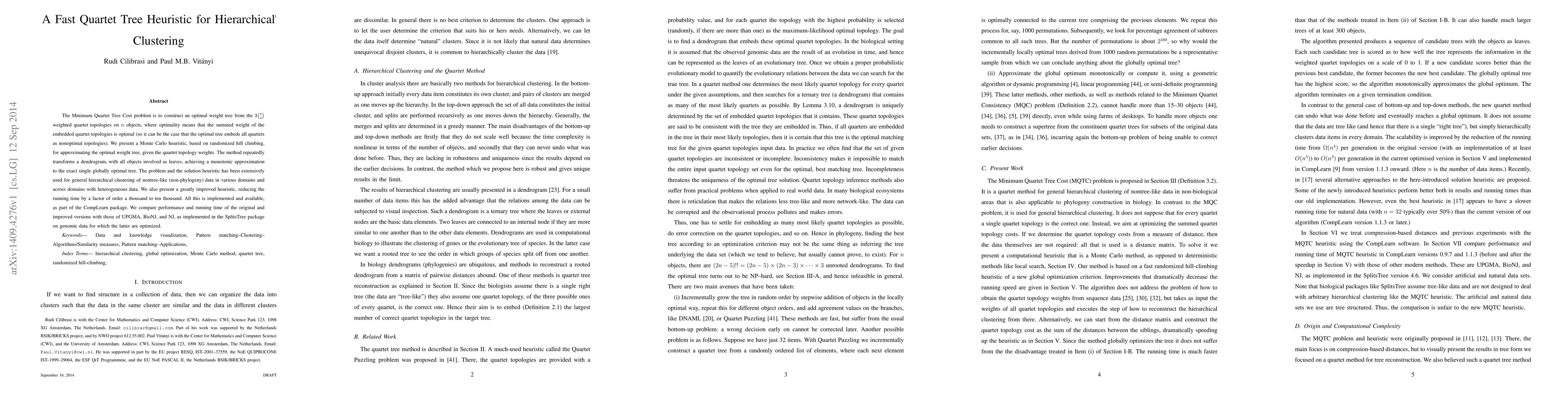 The Minimum Quartet Tree Cost problem is to construct an optimal weight tree from the $3{n \choose 4}$ weighted quartet topologies on $n$ objects, where optimality means that the summed weight of the embedded quartet topologies is optimal (so it can be the case that the optimal tree embeds all quartets as nonoptimal topologies). We present a Monte Carlo heuristic, based on randomized hill climbing, for approximating the optimal weight tree, given the quartet topology weights. The method repeatedly transforms a dendrogram, with all objects involved as leaves, achieving a monotonic approximation to the exact single globally optimal tree. The problem and the solution heuristic has been extensively used for general hierarchical clustering of nontree-like (non-phylogeny) data in various domains and across domains with heterogeneous data. We also present a greatly improved heuristic, reducing the running time by a factor of order a thousand to ten thousand. All this is implemented and available, as part of the CompLearn package. We compare performance and running time of the original and improved versions with those of UPGMA, BioNJ, and NJ, as implemented in the SplitsTree package on genomic data for which the latter are optimized. Keywords: Data and knowledge visualization, Pattern matching--Clustering--Algorithms/Similarity measures, Hierarchical clustering, Global optimization, Quartet tree, Randomized hill-climbing,