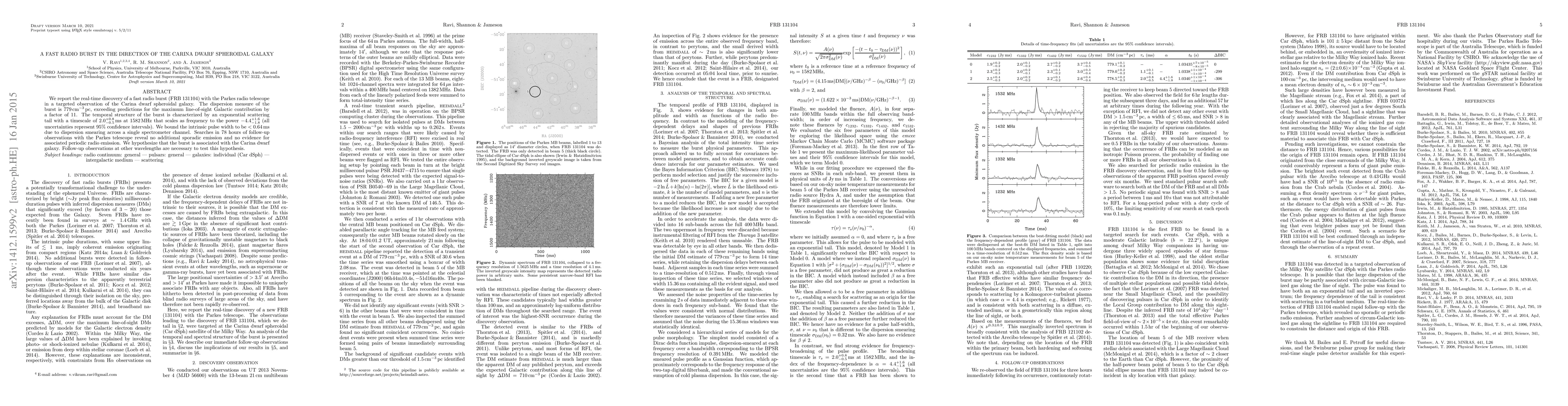 A fast radio burst (FRB 131104) was detected towards the Carina dwarf spheroidal galaxy, showing an unusually high dispersion measure and an exponential scattering tail. Follow-up observations found no additional bursts or periodic signals, suggesting an association with the Carina dwarf galaxy, though further multi-wavelength observations are needed to confirm this hypothesis.