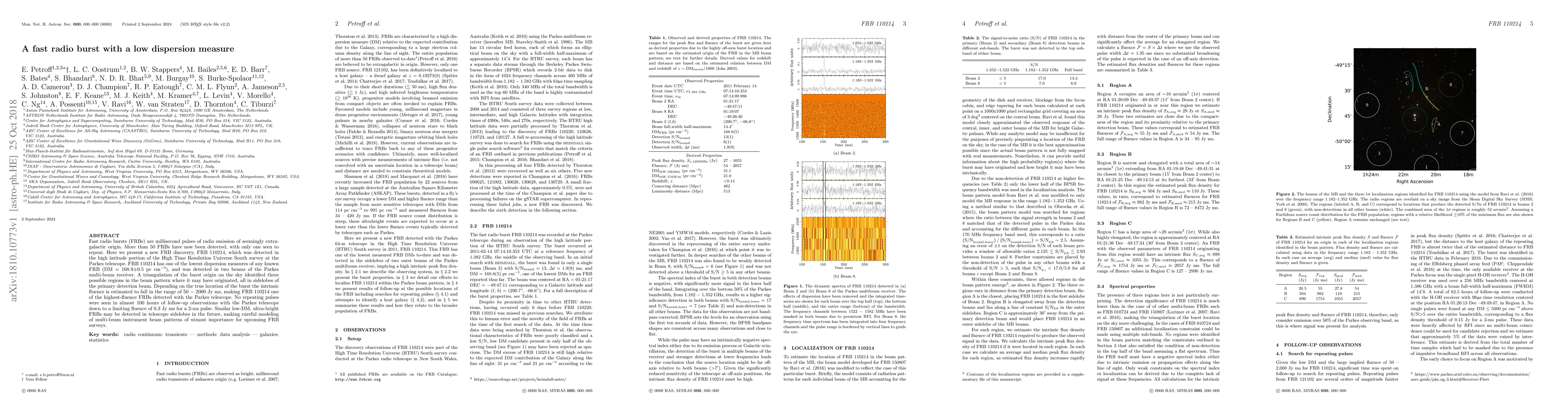 This paper reports the discovery of FRB 110214, a fast radio burst with an exceptionally low dispersion measure of 168.9±0.5 pc cm$^{-3}$, detected in the sidelobes of the Parkes telescope's beams. The intrinsic fluence ranges from 50 to 2000 Jy ms, indicating it is one of the brightest FRBs detected with the Parkes telescope.