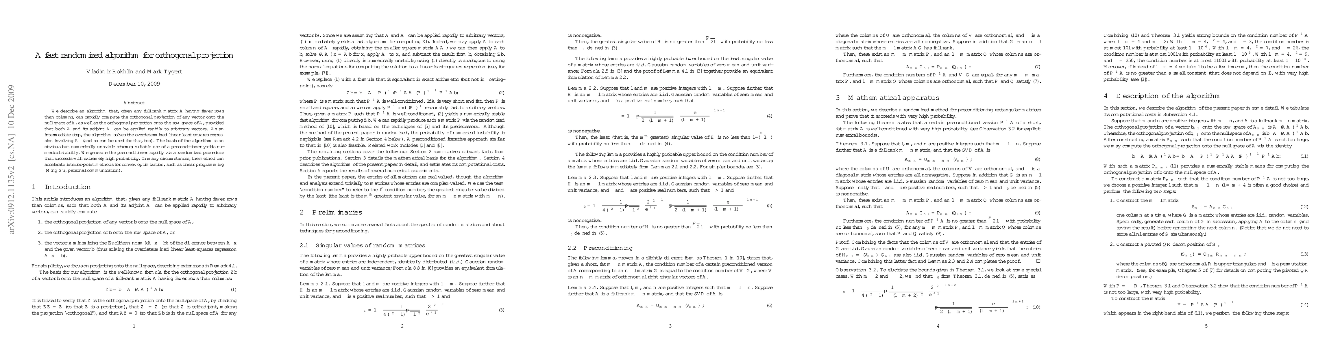 We describe an algorithm that, given any full-rank matrix A having fewer rows than columns, can rapidly compute the orthogonal projection of any vector onto the null space of A, as well as the orthogonal projection onto the row space of A, provided that both A and its adjoint can be applied rapidly to arbitrary vectors. As an intermediate step, the algorithm solves the overdetermined linear least-squares regression involving the adjoint of A (and so can be used for this, too). The basis of the algorithm is an obvious but numerically unstable scheme; suitable use of a preconditioner yields numerical stability. We generate the preconditioner rapidly via a randomized procedure that succeeds with extremely high probability. In many circumstances, the method can accelerate interior-point methods for convex optimization, such as linear programming (Ming Gu, personal communication).
