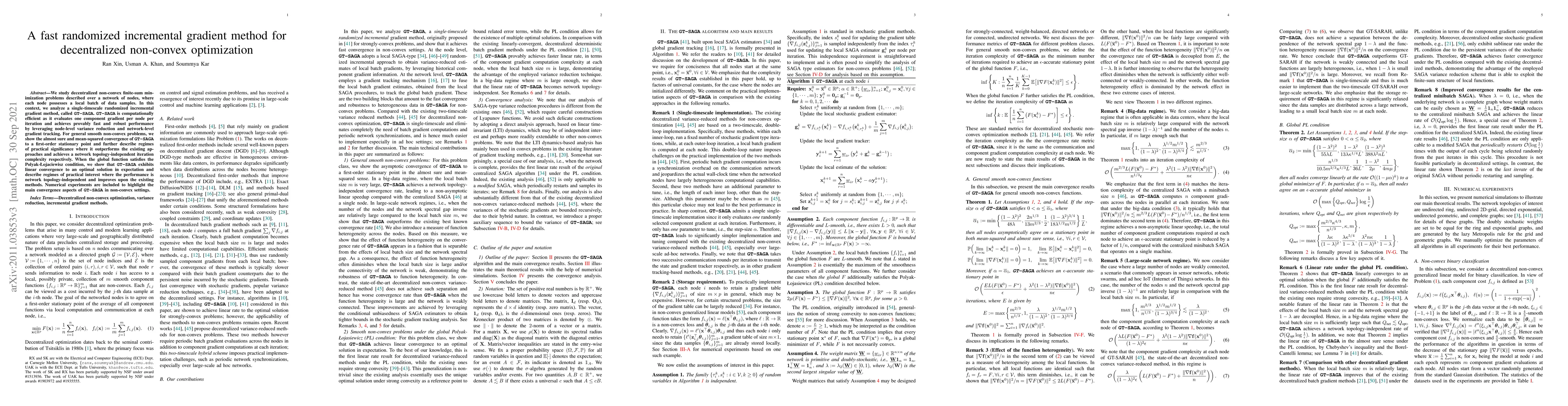 We study decentralized non-convex finite-sum minimization problems described over a network of nodes, where each node possesses a local batch of data samples. In this context, we analyze a single-timescale randomized incremental gradient method, called GT-SAGA. GT-SAGA is computationally efficient as it evaluates one component gradient per node per iteration and achieves provably fast and robust performance by leveraging node-level variance reduction and network-level gradient tracking. For general smooth non-convex problems, we show the almost sure and mean-squared convergence of GT-SAGA to a first-order stationary point and further describe regimes of practical significance where it outperforms the existing approaches and achieves a network topology-independent iteration complexity respectively. When the global function satisfies the Polyak-Lojaciewisz condition, we show that GT-SAGA exhibits linear convergence to an optimal solution in expectation and describe regimes of practical interest where the performance is network topology-independent and improves upon the existing methods. Numerical experiments are included to highlight the main convergence aspects of GT-SAGA in non-convex settings.