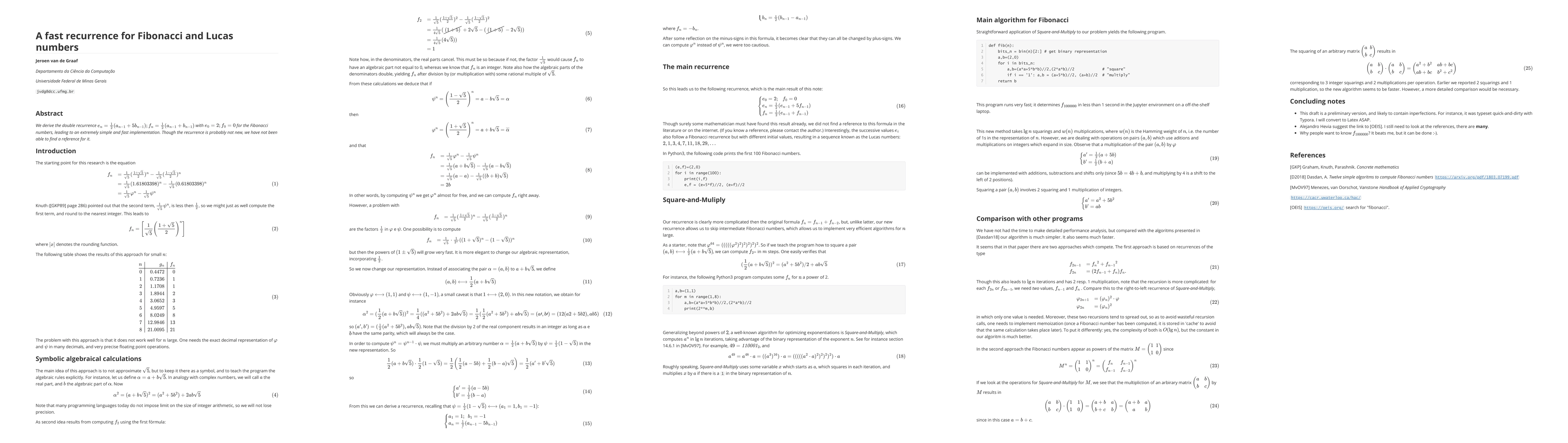 We derive the double recurrence $e_n = \frac{1}{2}(a_{n-1}+5b_{n-1}); f_{n} = \frac{1}{2}(a_{n-1}+b_{n-1})$ with $e_0=2;f_0=0$ for the Fibonacci numbers, leading to an extremely simple and fast implementation. Though the recurrence is probably not new, we have not been able to find a reference for it.