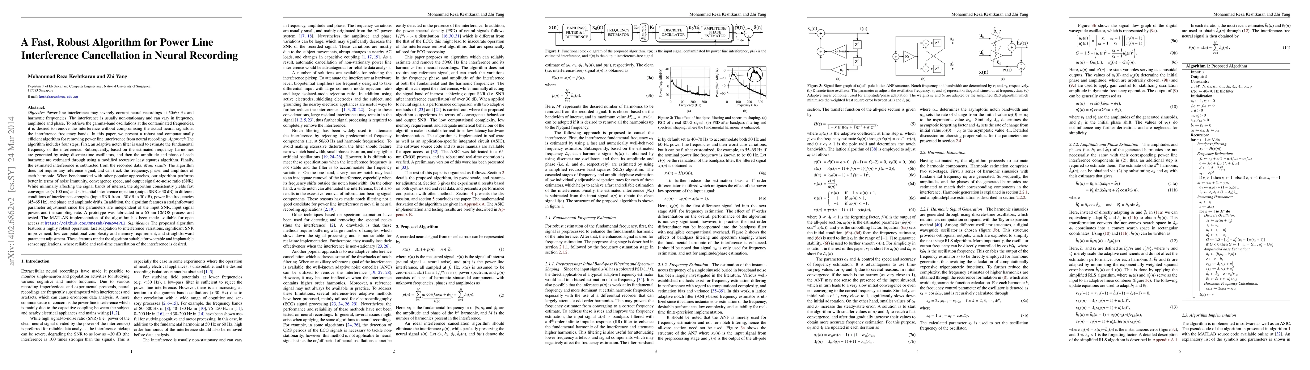 Power line interference may severely corrupt neural recordings at 50/60 Hz and harmonic frequencies. In this paper, we present a robust and computationally efficient algorithm for removing power line interference from neural recordings. The algorithm includes four steps. First, an adaptive notch filter is used to estimate the fundamental frequency of the interference. Subsequently, based on the estimated frequency, harmonics are generated by using discrete-time oscillators, and then the amplitude and phase of each harmonic are estimated through using a modified recursive least squares algorithm. Finally, the estimated interference is subtracted from the recorded data. The algorithm does not require any reference signal, and can track the frequency, phase, and amplitude of each harmonic. When benchmarked with other popular approaches, our algorithm performs better in terms of noise immunity, convergence speed, and output signal-to-noise ratio (SNR). While minimally affecting the signal bands of interest, the algorithm consistently yields fast convergence and substantial interference rejection in different conditions of interference strengths (input SNR from -30 dB to 30 dB), power line frequencies (45-65 Hz), and phase and amplitude drifts. In addition, the algorithm features a straightforward parameter adjustment since the parameters are independent of the input SNR, input signal power, and the sampling rate. The proposed algorithm features a highly robust operation, fast adaptation to interference variations, significant SNR improvement, low computational complexity and memory requirement, and straightforward parameter adjustment. These features render the algorithm suitable for wearable and implantable sensor applications, where reliable and real-time cancellation of the interference is desired.