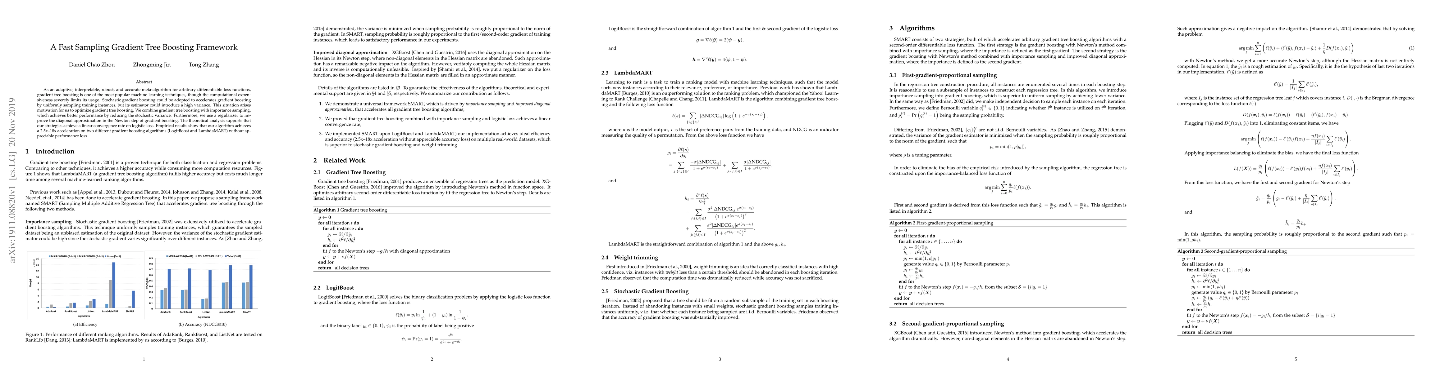 This paper proposes a fast sampling gradient tree boosting framework that combines importance sampling and a regularizer to reduce stochastic variance and improve the diagonal approximation. Theoretical analysis and empirical results show a significant acceleration (2.5x--18x) in two gradient boosting algorithms with minimal loss in performance.