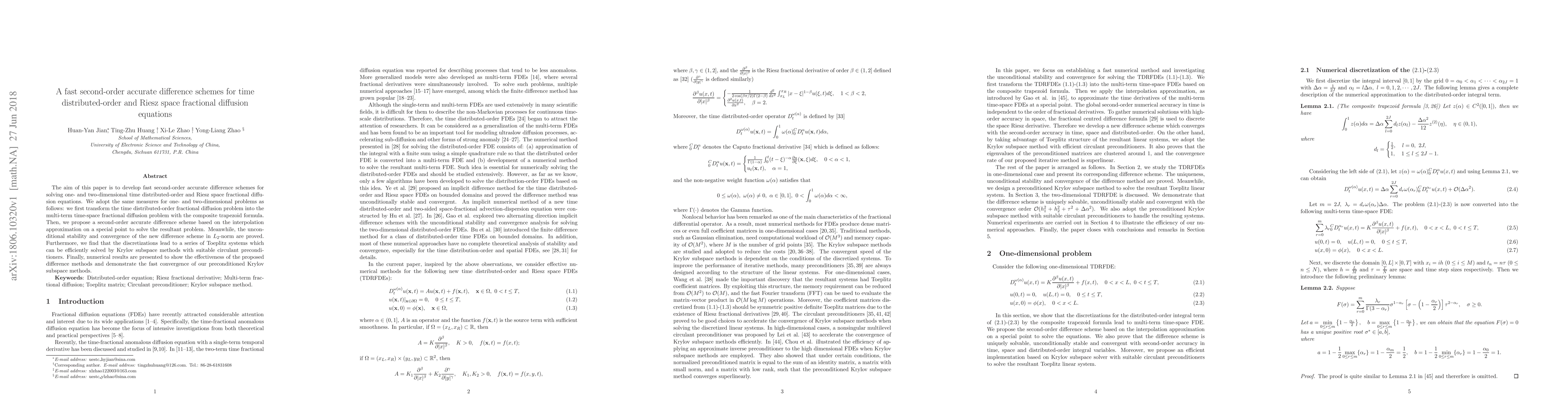 This paper develops fast second-order accurate difference schemes for solving time distributed-order and Riesz space fractional diffusion equations. The proposed method transforms the problem into a multi-term fractional diffusion problem, employs interpolation for accuracy, and utilizes Krylov subspace methods with circulant preconditioners for efficient solution.