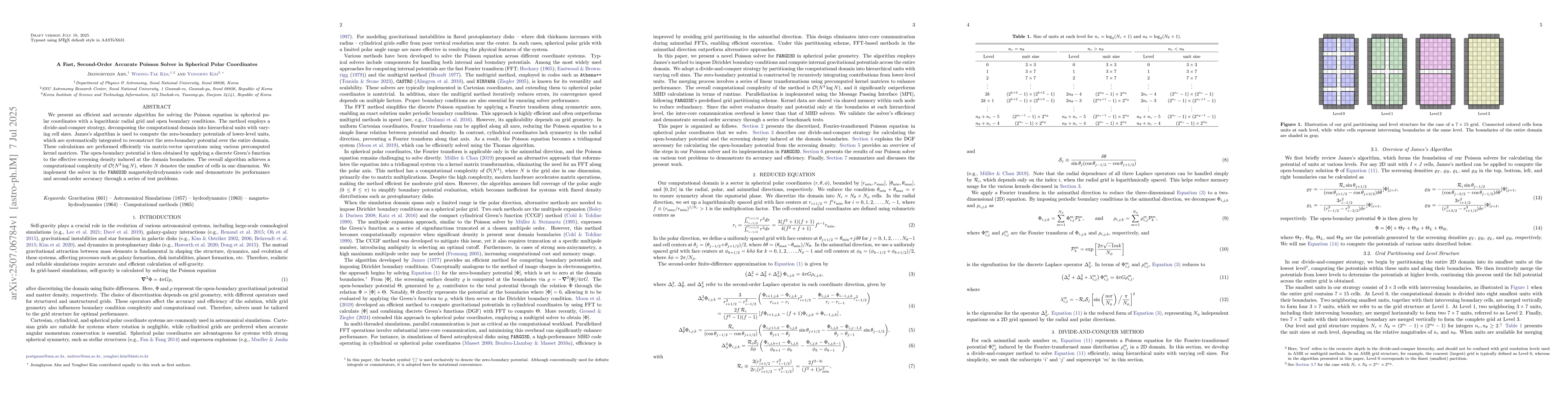 We present an efficient and accurate algorithm for solving the Poisson equation in spherical polar coordinates with a logarithmic radial grid and open boundary conditions. The method employs a divide-and-conquer strategy, decomposing the computational domain into hierarchical units with varying cell sizes. James's algorithm is used to compute the zero-boundary potentials of lower-level units, which are systematically integrated to reconstruct the zero-boundary potential over the entire domain. These calculations are performed efficiently via matrix-vector operations using various precomputed kernel matrices. The open-boundary potential is then obtained by applying a discrete Green's function to the effective screening density induced at the domain boundaries. The overall algorithm achieves a computational complexity of $\mathcal{O}(N^3 \log N)$, where $N$ denotes the number of cells in one dimension. We implement the solver in the FARGO3D magnetohydrodynamics code and demonstrate its performance and second-order accuracy through a series of test problems.