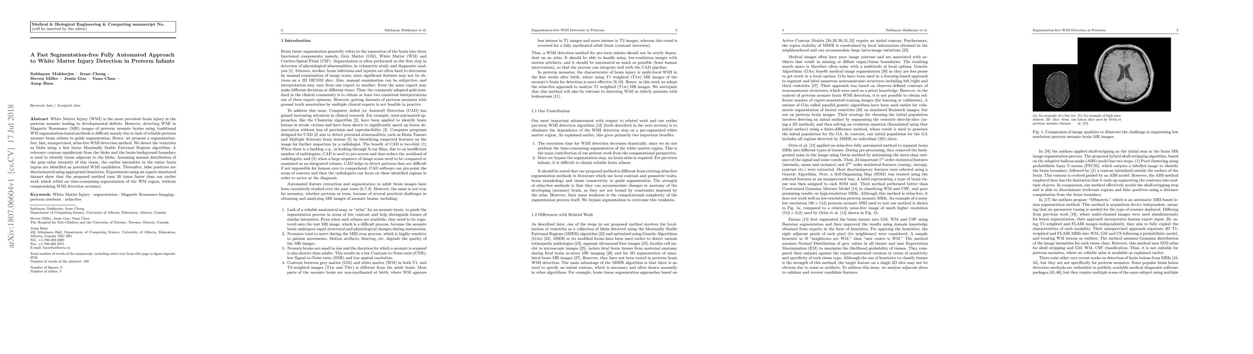 This paper proposes a fast, segmentation-free, and unsupervised method for detecting White Matter Injury (WMI) in preterm infants using MR images. The method identifies potential WMI candidates by analyzing gray-value intensities near ventricles detected via a linear algorithm, achieving 20 times faster processing than previous segmentation-based methods.