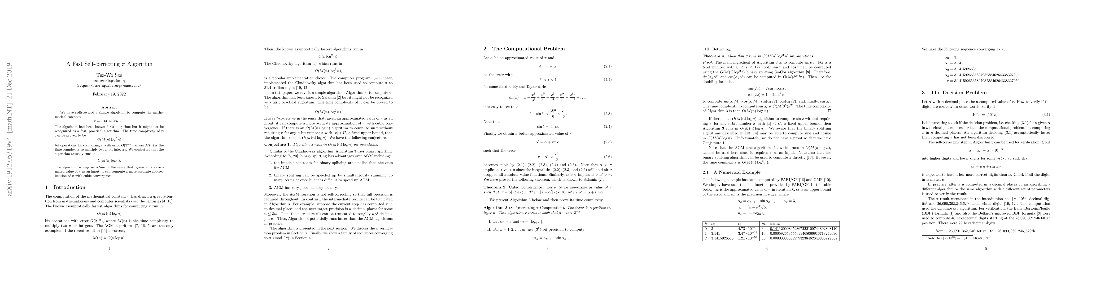 We have rediscovered a simple algorithm to compute the mathematical constant \[ \pi=3.14159265\cdots. \] The algorithm had been known for a long time but it might not be recognized as a fast, practical algorithm. The time complexity of it can be proved to be \[ O(M(n)\log^2 n) \] bit operations for computing $\pi$ with error $O(2^{-n})$, where $M(n)$ is the time complexity to multiply two $n$-bit integers. We conjecture that the algorithm actually runs in \[ O(M(n)\log n). \] The algorithm is \emph{self-correcting} in the sense that, given an approximated value of $\pi$ as an input, it can compute a more accurate approximation of $\pi$ with cubic convergence.