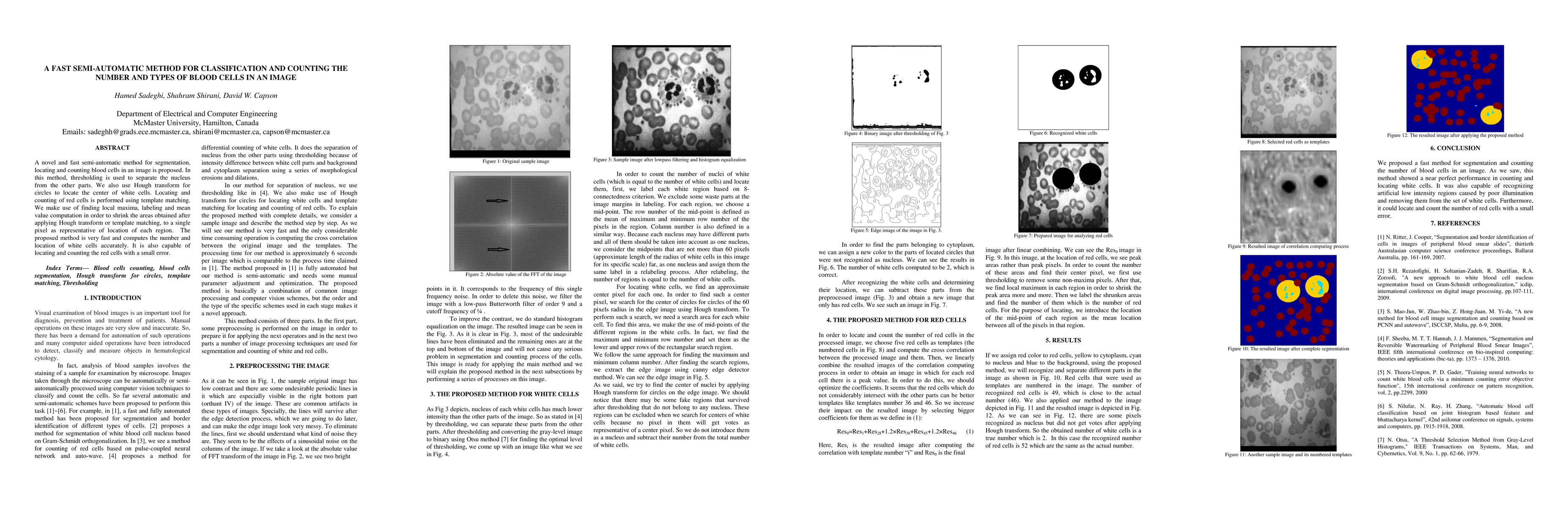 This paper proposes a fast semi-automatic method for segmenting, locating, and counting blood cells in images using thresholding, Hough transform, and template matching. The method accurately counts white blood cells and locates red blood cells with minimal error.