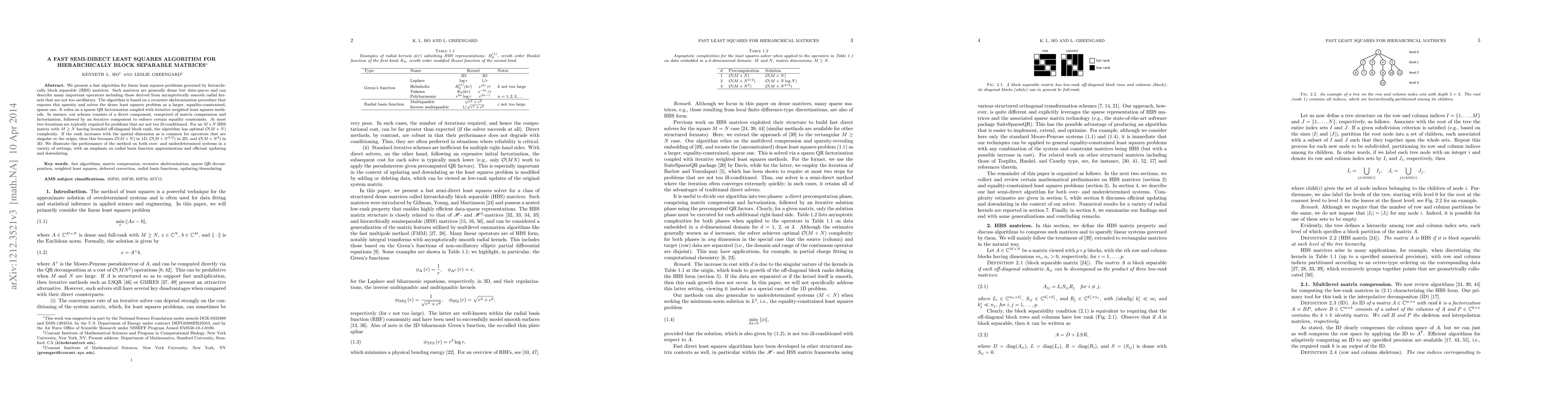 This paper introduces a fast semi-direct least squares algorithm for solving linear least squares problems involving hierarchically block separable matrices, leveraging matrix compression and sparse QR factorization. The method achieves optimal complexity and demonstrates efficient performance for both over- and underdetermined systems, especially in radial basis function approximation.