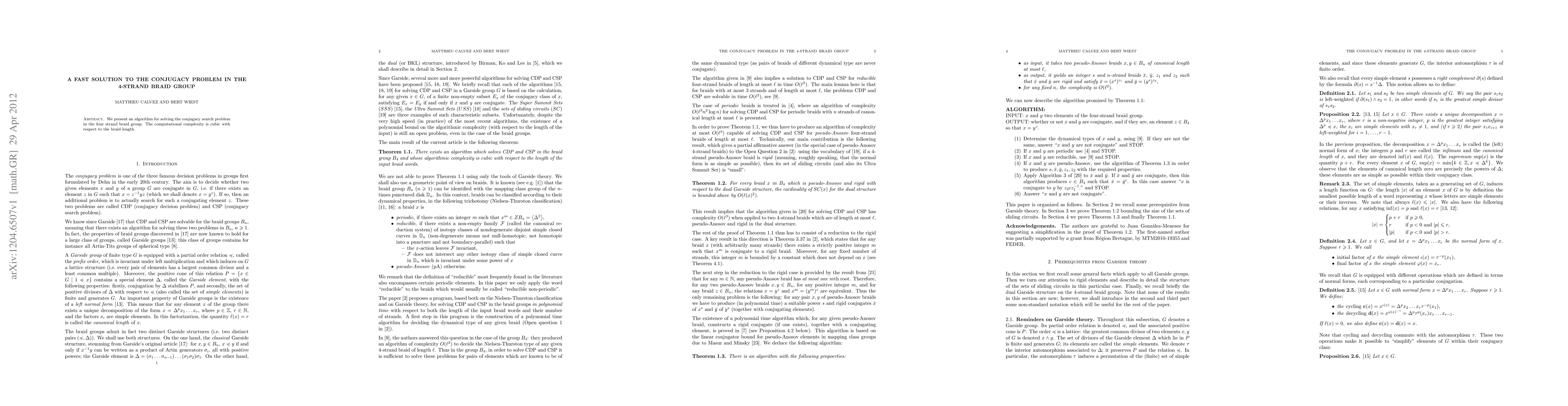 We present an algorithm for solving the conjugacy search problem in the four strand braid group. The computational complexity is cubic with respect to the braid length.