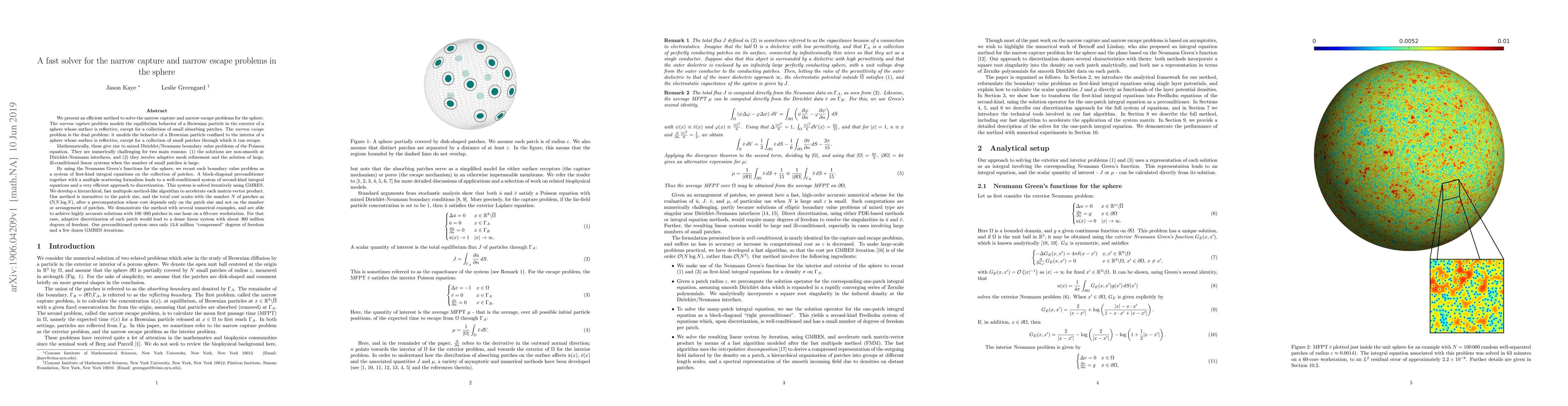 Researchers developed an efficient method to solve two complex problems involving Brownian particles in a sphere, achieving highly accurate solutions with 100,000 patches in under one hour on a 60-core workstation.