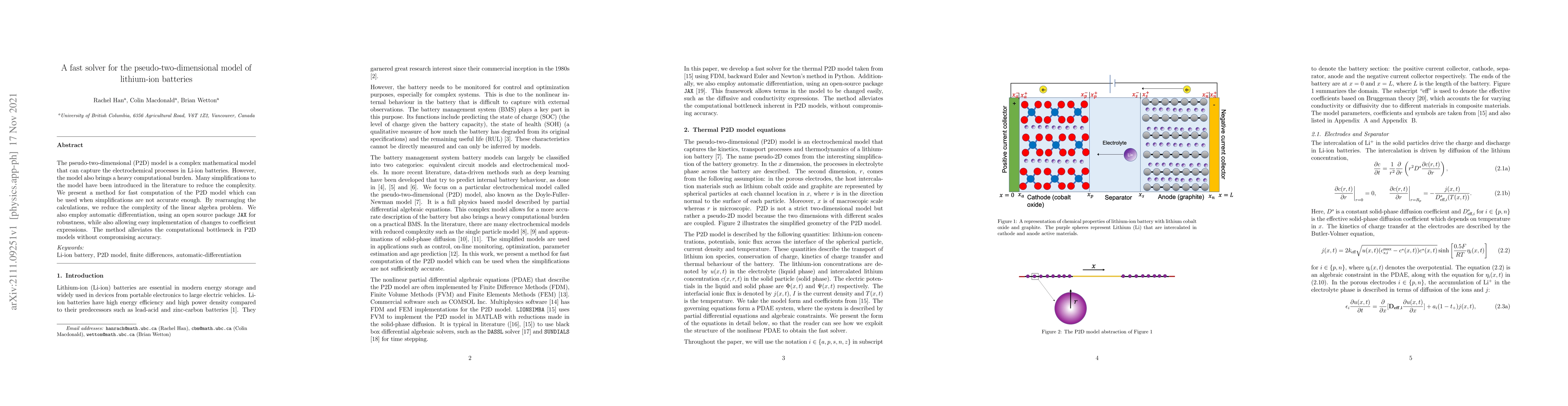 This paper presents a fast solver for the computationally intensive pseudo-two-dimensional model of lithium-ion batteries, reducing complexity through optimized linear algebra and automatic differentiation using the JAX package, thereby alleviating computational bottlenecks without sacrificing accuracy.