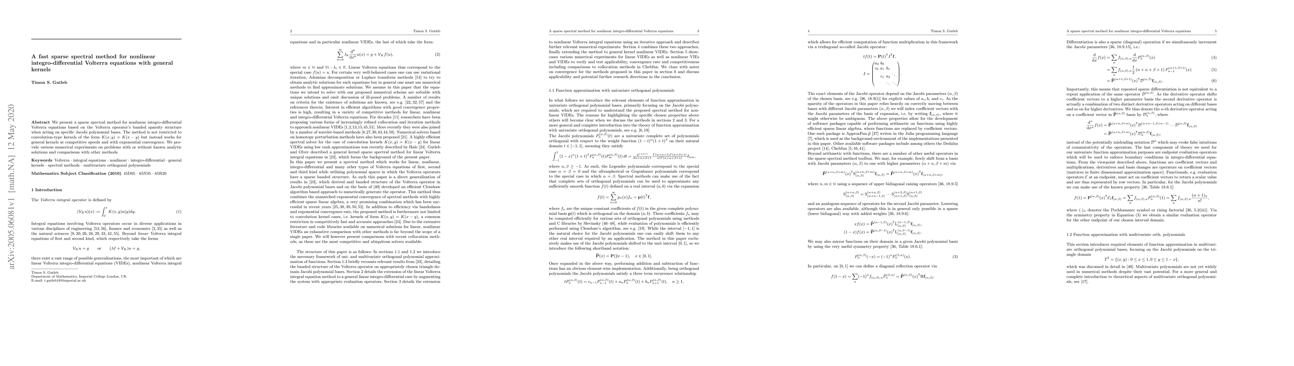 We present a sparse spectral method for nonlinear integro-differential Volterra equations based on the Volterra operator's banded sparsity structure when acting on specific Jacobi polynomial bases. The method is not restricted to convolution-type kernels of the form $K(x,y)=K(x-y)$ but instead works for general kernels at competitive speeds and with exponential convergence. We provide various numerical experiments on problems with or without known analytic solutions and comparisons with other methods.