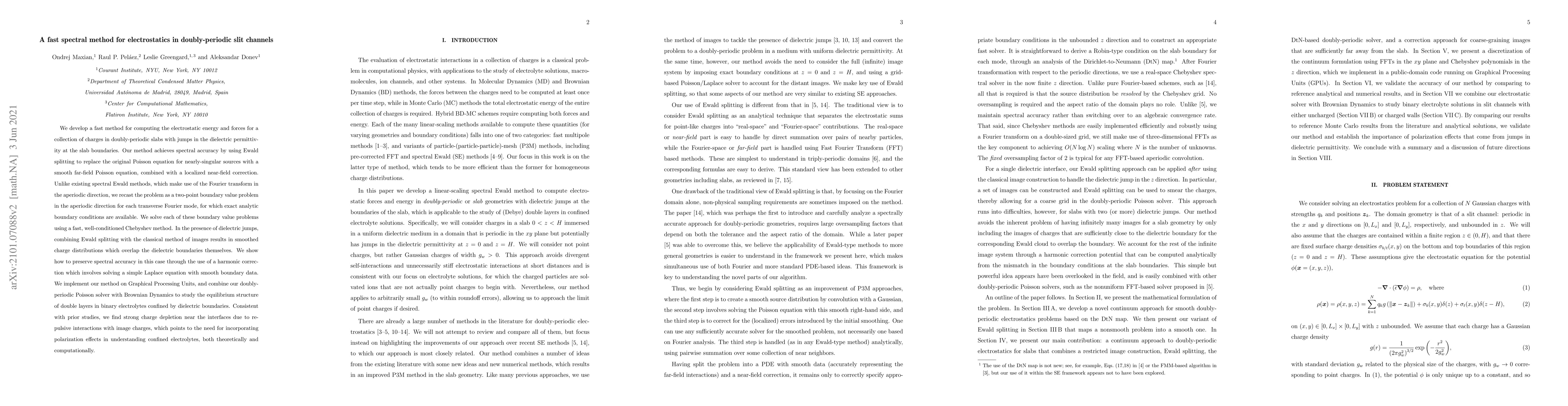 We develop a fast method for computing the electrostatic energy and forces for a collection of charges in doubly-periodic slabs with jumps in the dielectric permittivity at the slab boundaries. Our method achieves spectral accuracy by using Ewald splitting to replace the original Poisson equation for nearly-singular sources with a smooth far-field Poisson equation, combined with a localized near-field correction. Unlike existing spectral Ewald methods, which make use of the Fourier transform in the aperiodic direction, we recast the problem as a two-point boundary value problem in the aperiodic direction for each transverse Fourier mode, for which exact analytic boundary conditions are available. We solve each of these boundary value problems using a fast, well-conditioned Chebyshev method. In the presence of dielectric jumps, combining Ewald splitting with the classical method of images results in smoothed charge distributions which overlap the dielectric boundaries themselves. We show how to preserve spectral accuracy in this case through the use of a harmonic correction which involves solving a simple Laplace equation with smooth boundary data. We implement our method on Graphical Processing Units, and combine our doubly-periodic Poisson solver with Brownian Dynamics to study the equilibrium structure of double layers in binary electrolytes confined by dielectric boundaries. Consistent with prior studies, we find strong charge depletion near the interfaces due to repulsive interactions with image charges, which points to the need for incorporating polarization effects in understanding confined electrolytes, both theoretically and computationally.
