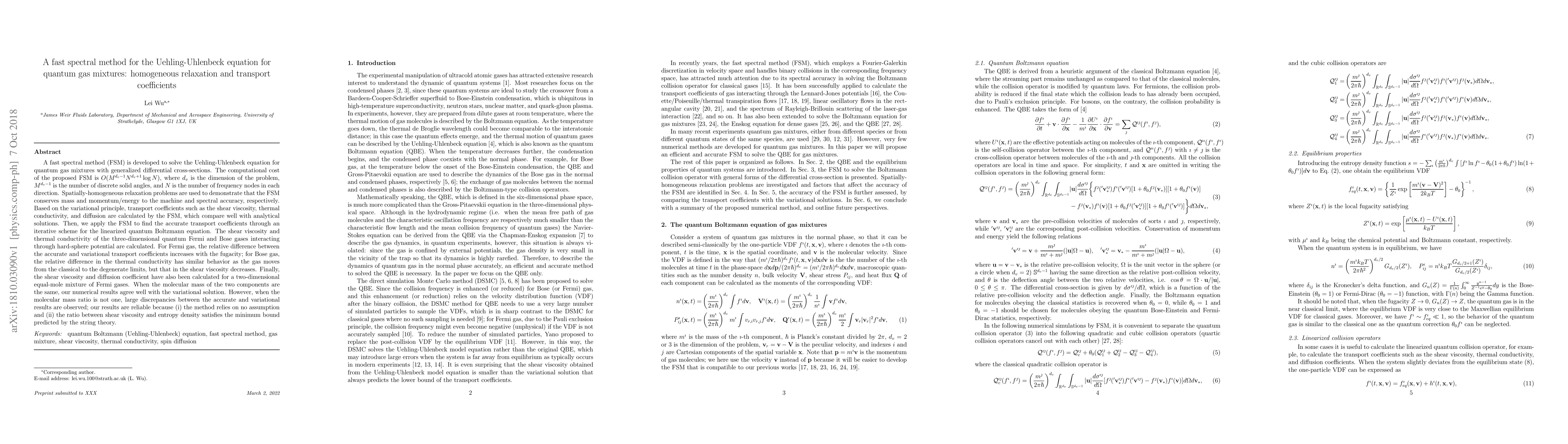 This paper develops a fast spectral method to solve the Uehling-Uhlenbeck equation for quantum gas mixtures, demonstrating its accuracy in calculating transport coefficients like shear viscosity and thermal conductivity. The method shows good agreement with analytical solutions for various quantum gases and mixtures, highlighting its reliability and applicability.