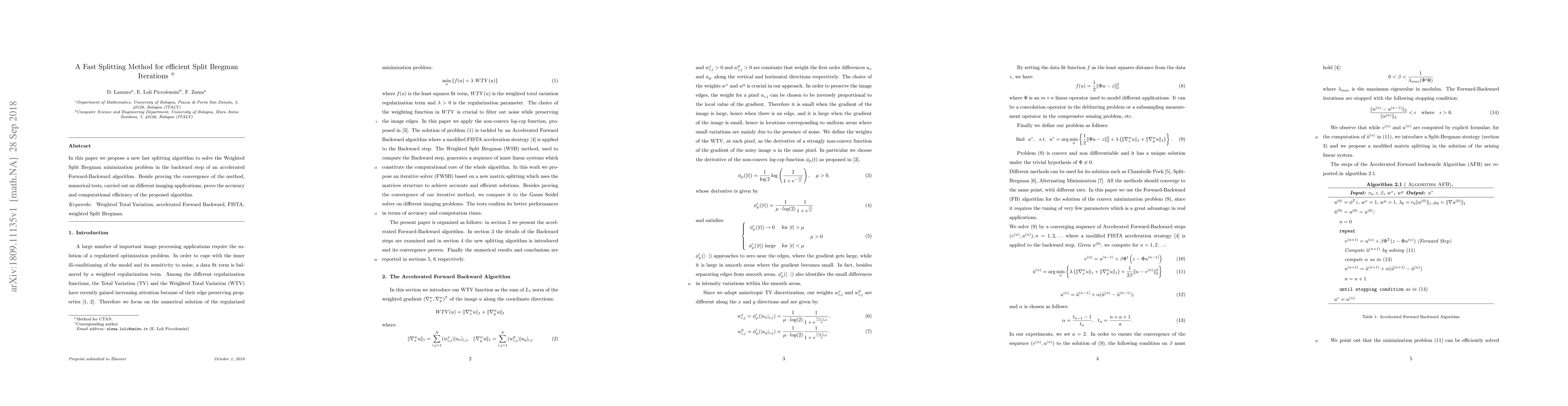 The paper proposes a new fast splitting algorithm for solving the Weighted Split Bregman minimization problem in the backward step of an accelerated Forward-Backward algorithm, using a splitting variable strategy and proving its convergence.