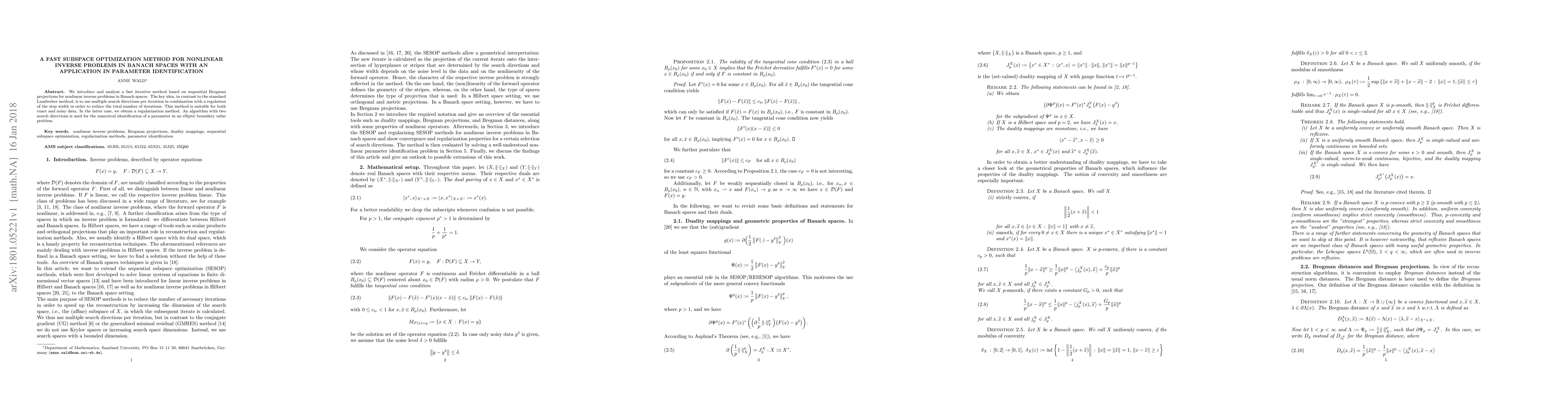 This paper proposes a fast iterative method using sequential Bregman projections for solving nonlinear inverse problems in Banach spaces, employing multiple search directions and step width regulation to reduce iteration count. The method is applied to parameter identification in an elliptic boundary value problem.