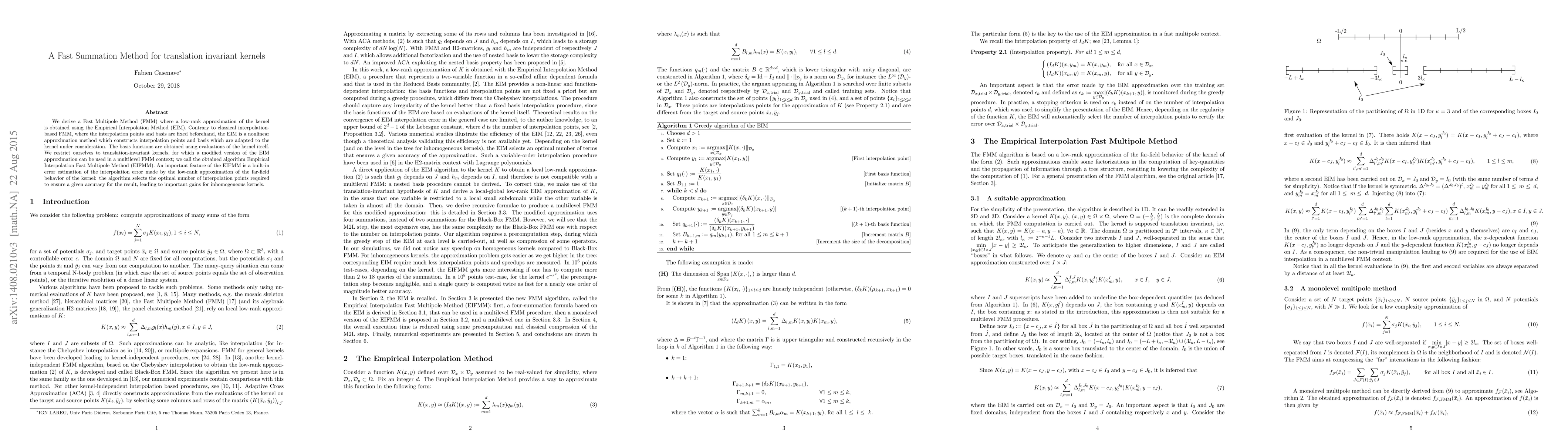 We derive a Fast Multipole Method (FMM) where a low-rank approximation of the kernel is obtained using the Empirical Interpolation Method (EIM). Contrary to classical interpolation-based FMM, where the interpolation points and basis are fixed beforehand, the EIM is a nonlinear approximation method which constructs interpolation points and basis which are adapted to the kernel under consideration. The basis functions are obtained using evaluations of the kernel itself. We restrict ourselves to translation-invariant kernels, for which a modified version of the EIM approximation can be used in a multilevel FMM context; we call the obtained algorithm Empirical Interpolation Fast Multipole Method (EIFMM). An important feature of the EIFMM is a built-in error estimation of the interpolation error made by the low-rank approximation of the far-field behavior of the kernel: the algorithm selects the optimal number of interpolation points required to ensure a given accuracy for the result, leading to important gains for inhomogeneous kernels.