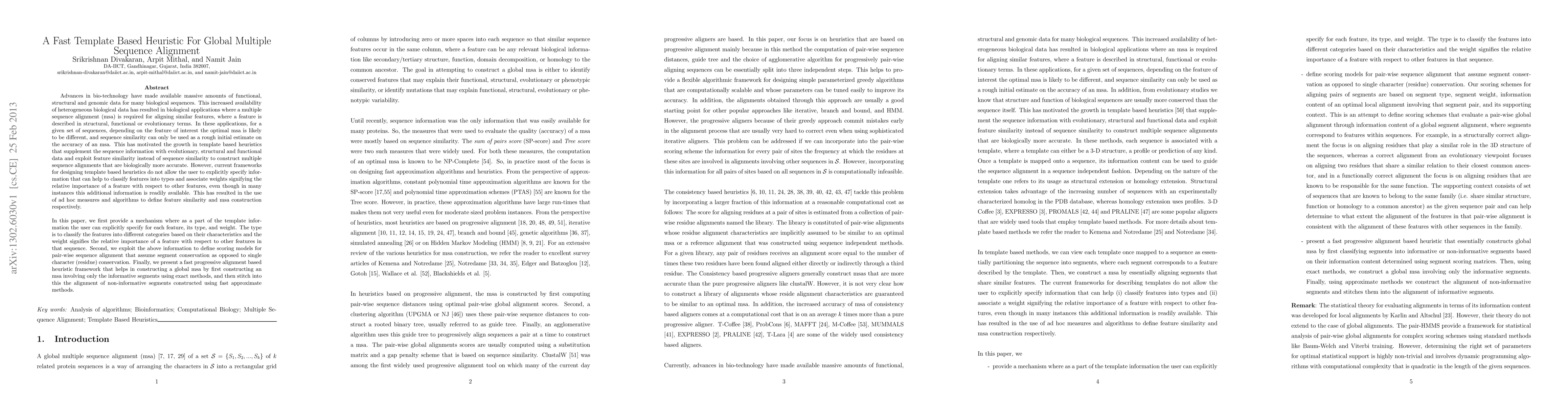 This paper introduces a fast template-based heuristic for global multiple sequence alignment, allowing users to specify the type and weight of each feature to improve alignment accuracy. It also presents a progressive alignment framework that leverages segment conservation for efficient global multiple sequence alignment.
