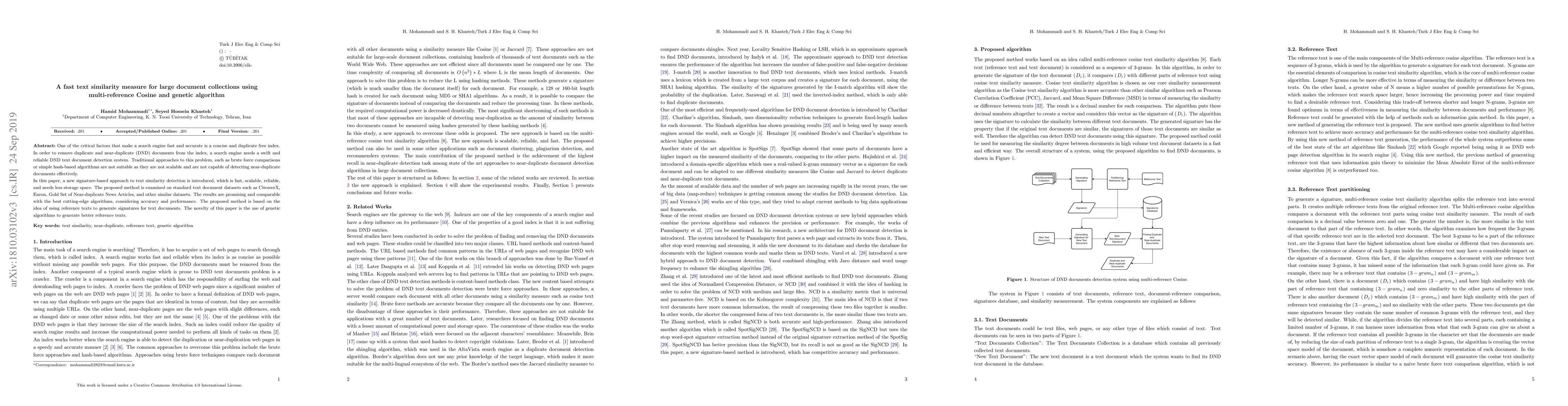 This paper introduces a fast and scalable text similarity measure for large document collections using multi-reference cosine and genetic algorithms to generate efficient signatures for detecting duplicate and near-duplicate documents. The proposed method is shown to outperform traditional methods in terms of speed, accuracy, and storage efficiency.