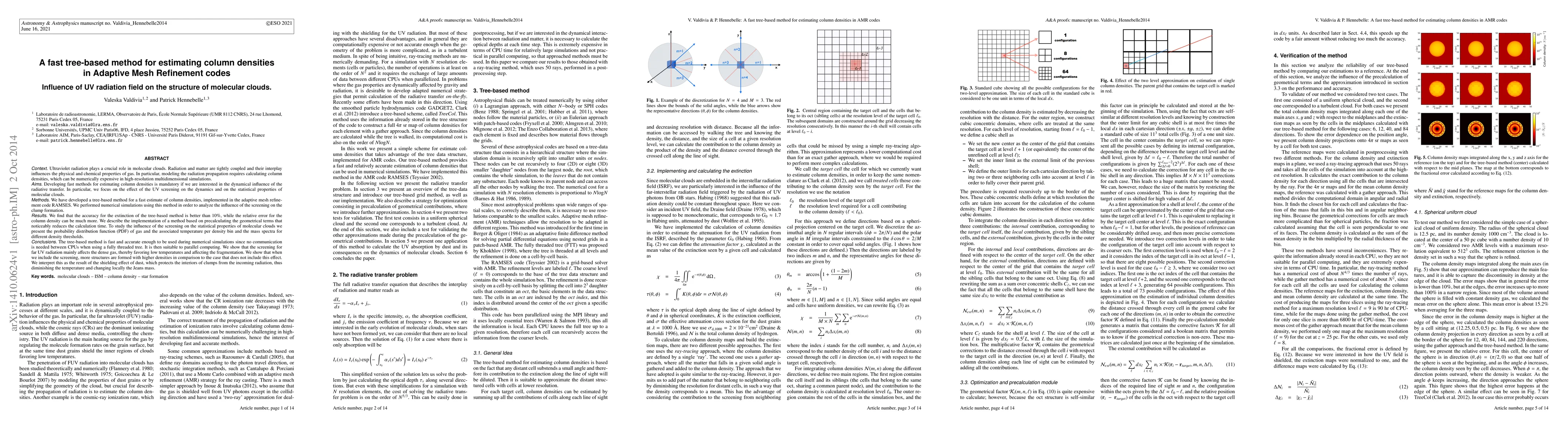 This paper develops a fast tree-based method for estimating column densities in Adaptive Mesh Refinement simulations, implemented in RAMSES, to study the influence of UV radiation on molecular clouds. The method shows accuracy within 10% for extinction and is suitable for parallel computing, revealing that UV screening impacts dense gas, favoring low temperatures and affecting fragmentation.