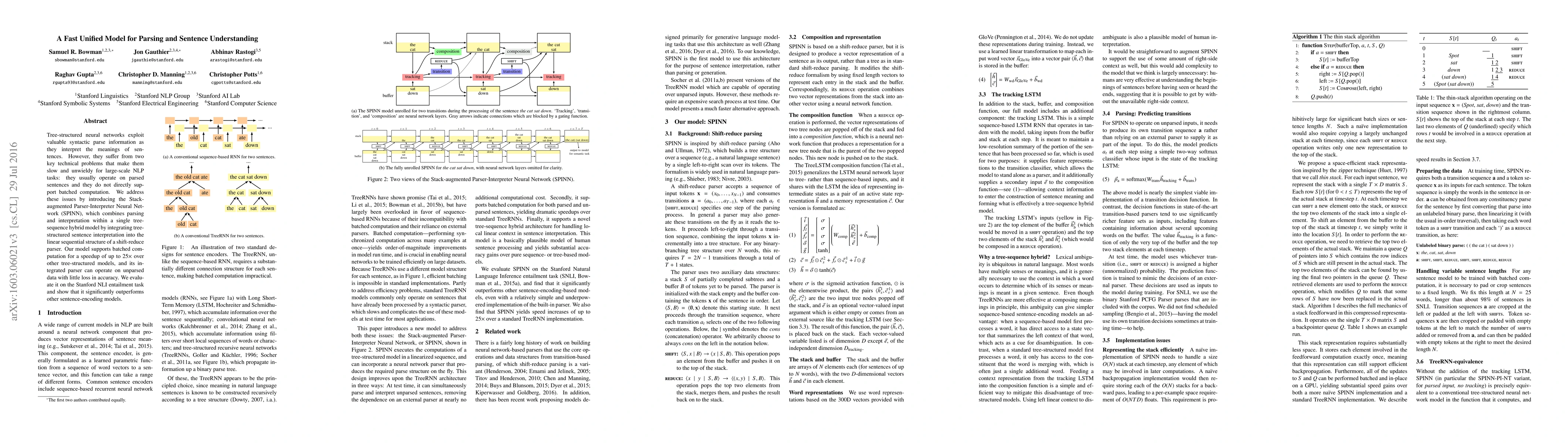 Researchers developed a new neural network model called SPINN that improves parsing and sentence understanding, achieving up to 25 times faster computation and better performance on natural language inference tasks.