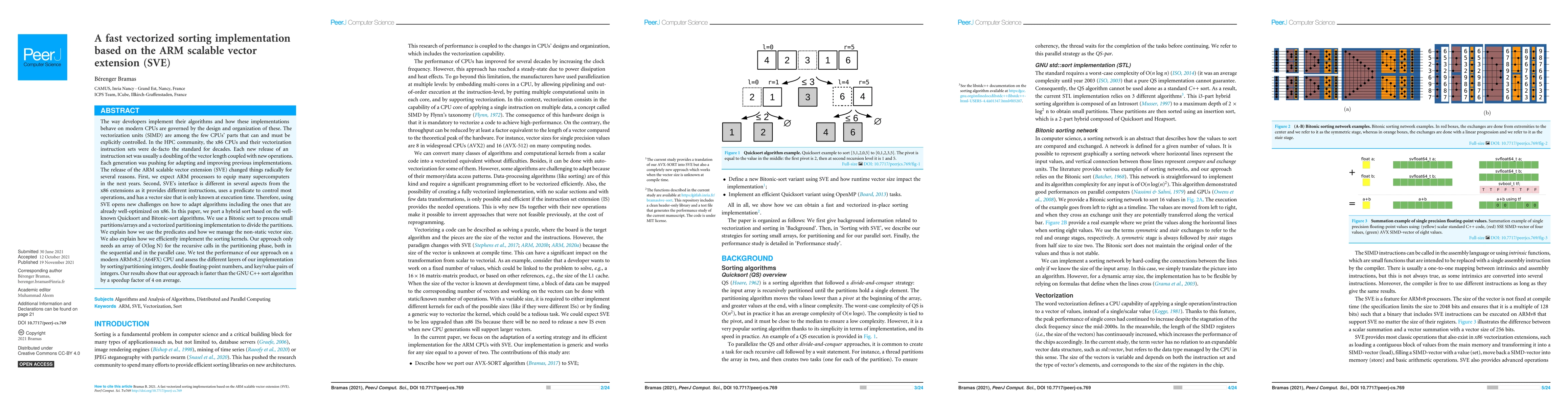 This paper presents a fast vectorized sorting implementation leveraging the ARM Scalable Vector Extension (SVE) for modern CPUs. It adapts a hybrid sort combining Quicksort and Bitonic-sort, optimizing for dynamic vector sizes and using predicates to manage operations, achieving up to four times faster performance than the GNU C++ sort algorithm on ARMv8.2.