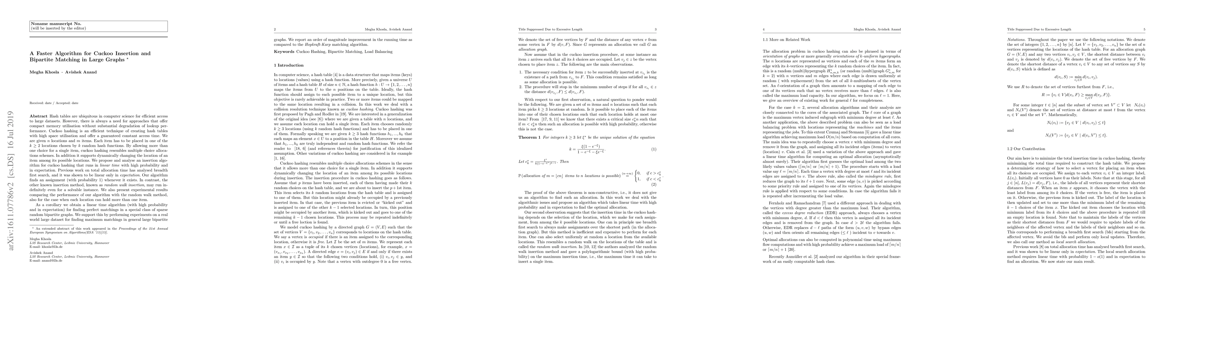 This paper proposes a faster linear-time algorithm for cuckoo hashing insertion and bipartite matching in large graphs, achieving linear time performance with high probability and in expectation. The algorithm outperforms the random walk method and significantly improves matching times in large bipartite graphs compared to the Hopcroft-Karp algorithm.