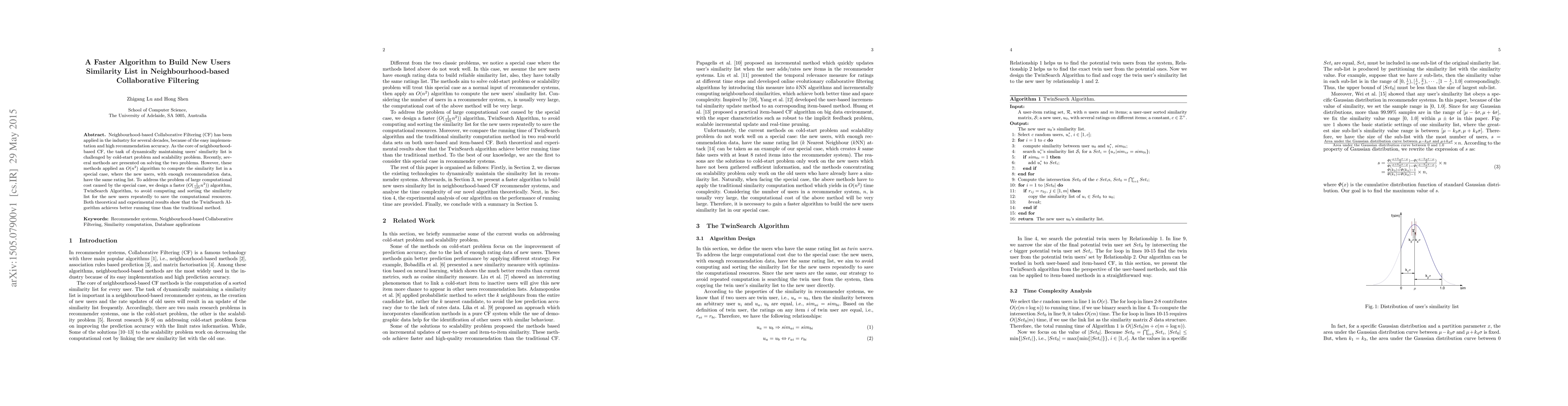 Neighbourhood-based Collaborative Filtering (CF) has been applied in the industry for several decades, because of the easy implementation and high recommendation accuracy. As the core of neighbourhood-based CF, the task of dynamically maintaining users' similarity list is challenged by cold-start problem and scalability problem. Recently, several methods are presented on solving the two problems. However, these methods applied an $O(n^2)$ algorithm to compute the similarity list in a special case, where the new users, with enough recommendation data, have the same rating list. To address the problem of large computational cost caused by the special case, we design a faster ($O(\frac{1}{125}n^2)$) algorithm, TwinSearch Algorithm, to avoid computing and sorting the similarity list for the new users repeatedly to save the computational resources. Both theoretical and experimental results show that the TwinSearch Algorithm achieves better running time than the traditional method.
