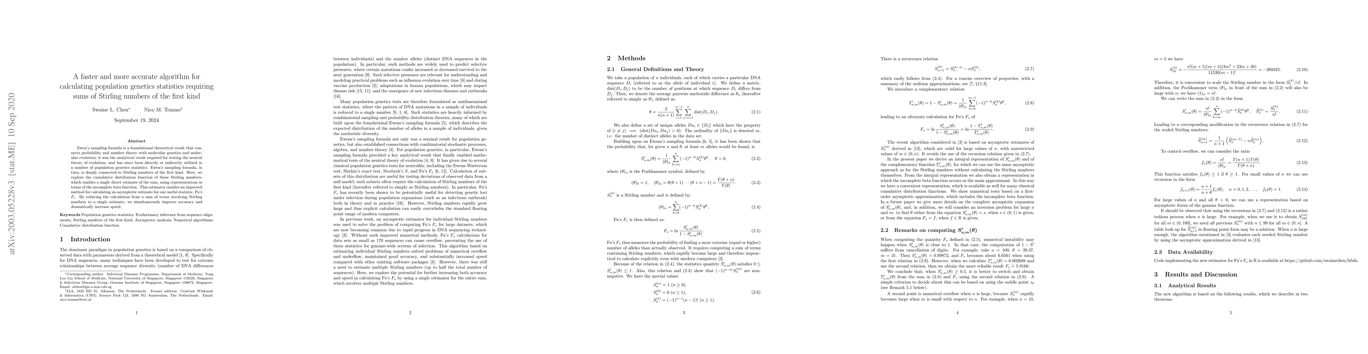 Stirling numbers of the first kind are used in the derivation of several population genetics statistics, which in turn are useful for testing evolutionary hypotheses directly from DNA sequences. Here, we explore the cumulative distribution function of these Stirling numbers, which enables a single direct estimate of the sum, using representations in terms of the incomplete beta function. This estimator enables an improved method for calculating an asymptotic estimate for one useful statistic, Fu's $F_s$. By reducing the calculation from a sum of terms involving Stirling numbers to a single estimate, we simultaneously improve accuracy and dramatically increase speed.