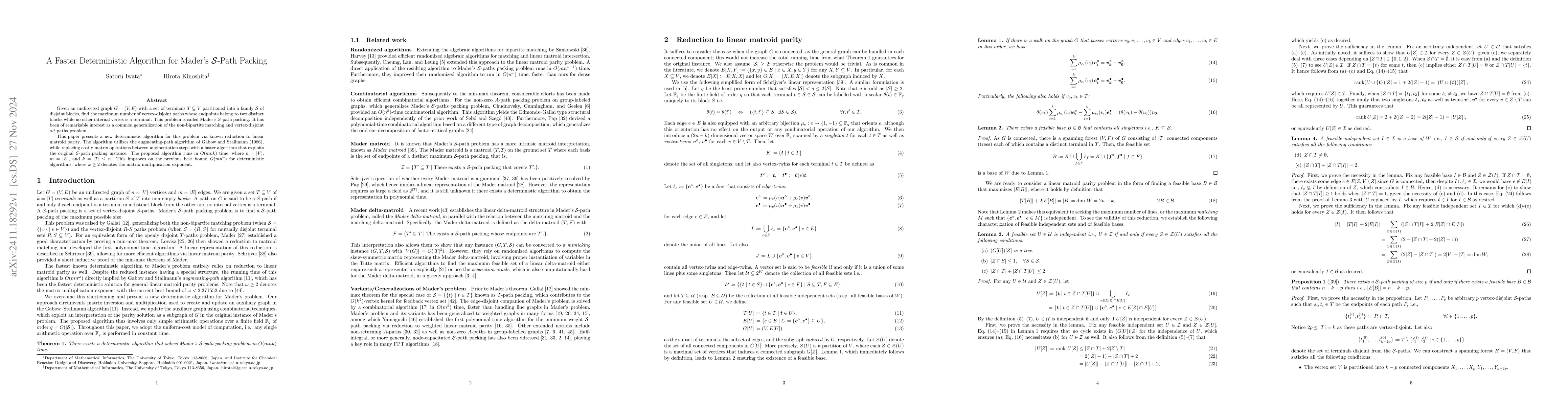 Given an undirected graph $G = (V,E)$ with a set of terminals $T\subseteq V$ partitioned into a family $\mathcal{S}$ of disjoint blocks, find the maximum number of vertex-disjoint paths whose endpoints belong to two distinct blocks while no other internal vertex is a terminal. This problem is called Mader's $\mathcal{S}$-path packing. It has been of remarkable interest as a common generalization of the non-bipartite matching and vertex-disjoint $s\text{-}t$ paths problem. This paper presents a new deterministic algorithm for this problem via known reduction to linear matroid parity. The algorithm utilizes the augmenting-path algorithm of Gabow and Stallmann (1986), while replacing costly matrix operations between augmentation steps with a faster algorithm that exploits the original $\mathcal{S}$-path packing instance. The proposed algorithm runs in $O(mnk)$ time, where $n = |V|$, $m = |E|$, and $k = |T|\le n$. This improves on the previous best bound $O(mn^{\omega})$ for deterministic algorithms, where $\omega\ge2$ denotes the matrix multiplication exponent.